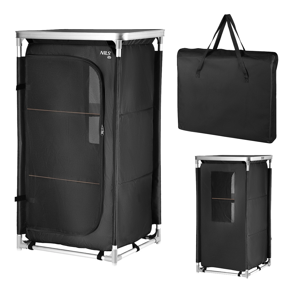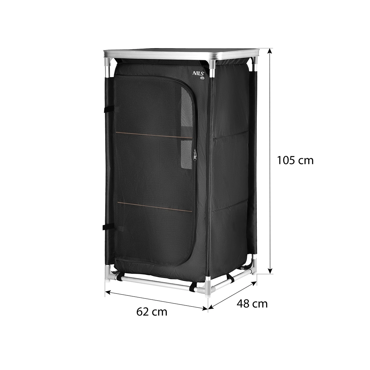 Ta kompaktowa szafa kempingowa NILS CAMP wprowadza porządek do każdego namiotu. Solidna rama z aluminiowych rurek o średnicy 19 mm łączy się za pomocą wytrzymałych plastikowych łączników, a specjalne dolne stopki zwiększają stabilność na nierównym podłożu. Pokrowiec z poliestru Oxford 600D jest wysoko odporny na zużycie i warunki atmosferyczne. Przedni panel z siatki zapewnia cyrkulację powietrza, można go zrolować i zabezpieczyć paskami lub zamknąć podwójnym zamkiem.