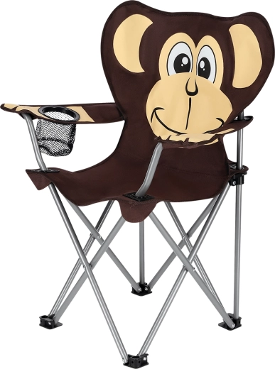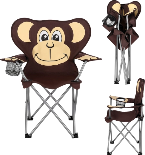Lekkie i stabilne dziecięce krzesło kempingowe z motywem małpki na wycieczki nad wodę, na ryby i festiwale. Oferuje wytrzymałą konstrukcję, udźwig 50 kg, regulowane podłokietniki oraz praktyczny uchwyt na napój. Dzięki szybkiemu składaniu i pokrowcowi z paskiem idealnie sprawdzi się w podróży.