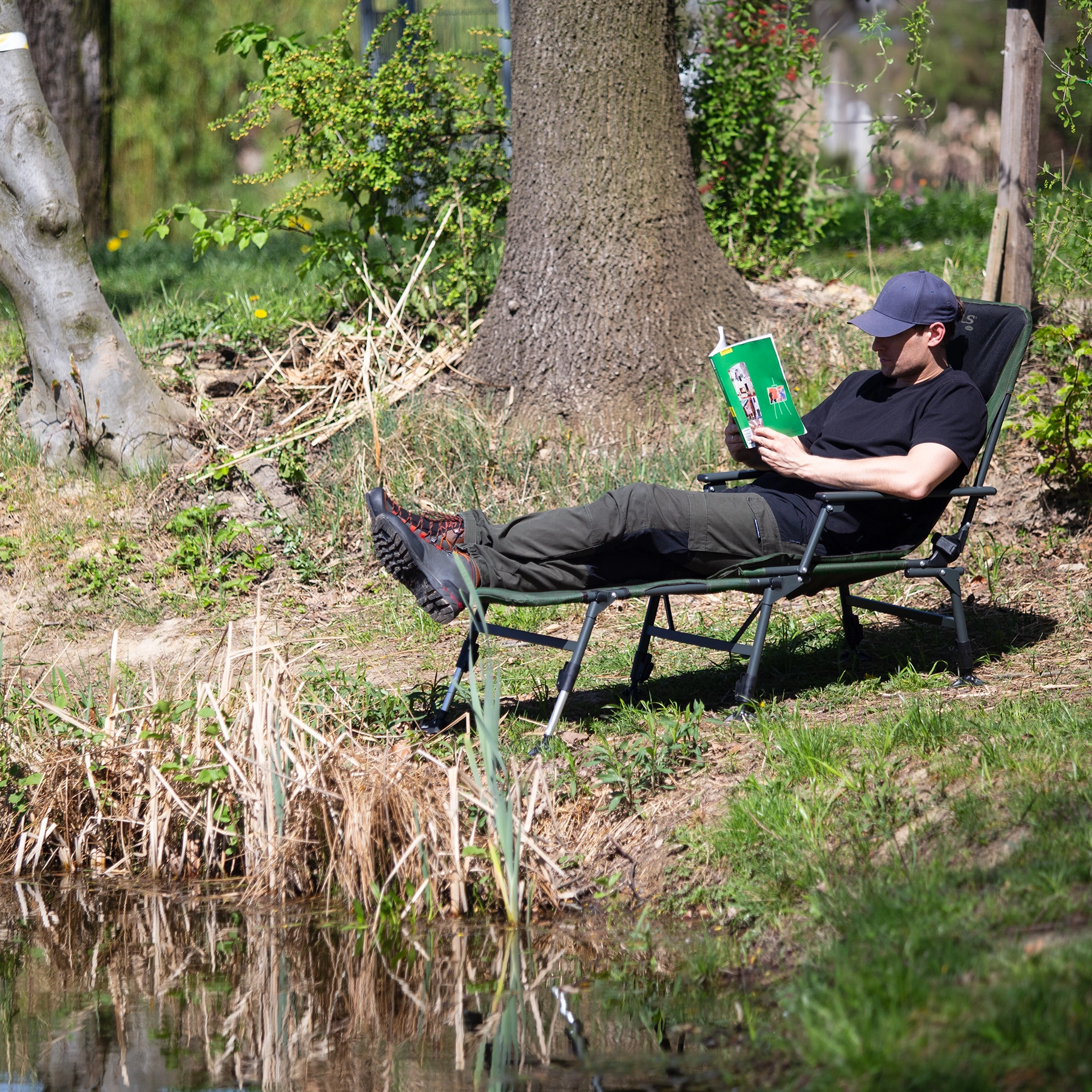 Płynna regulacja oparcia i odpinany podnóżek zamieniają fotel w wygodny leżak – idealny na dłuższe oczekiwanie nad wodą i odpoczynek po wędrówce.