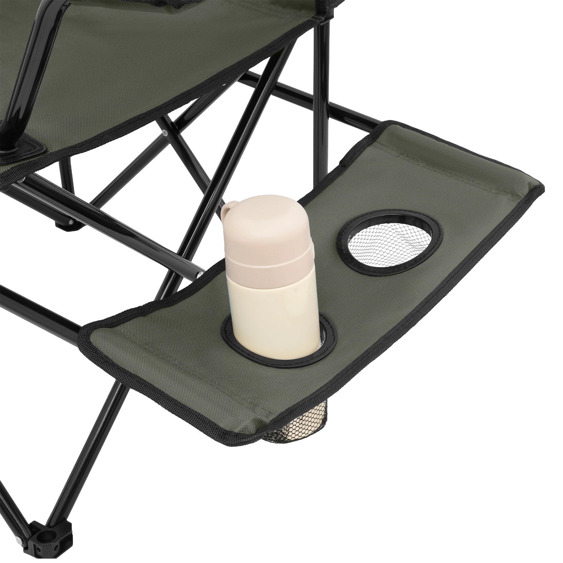 Przemyślane detale zwiększają komfort wypoczynku: w podłokietniku znajduje się siatkowy uchwyt na napój, a z boku praktyczny stolik z dwoma dodatkowymi uchwytami, więc butelkę, kubek i drobiazgi masz zawsze pod ręką. Po złożeniu krzesło mieści się w worku transportowym z uchem, który jest częścią zestawu.