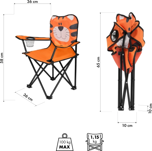 Lekki i wytrzymały dziecięcy fotelik kempingowy z motywem tygrysa łączy wygodę, bezpieczeństwo i łatwe składanie. Dzięki uchwytowi na napój, solidnej stalowej ramie oraz poszyciu z poliestru 600D z PVC idealnie sprawdzi się na kempingu, nad wodą i w ogrodzie. Niska waga i worek transportowy zapewniają łatwe przenoszenie.
