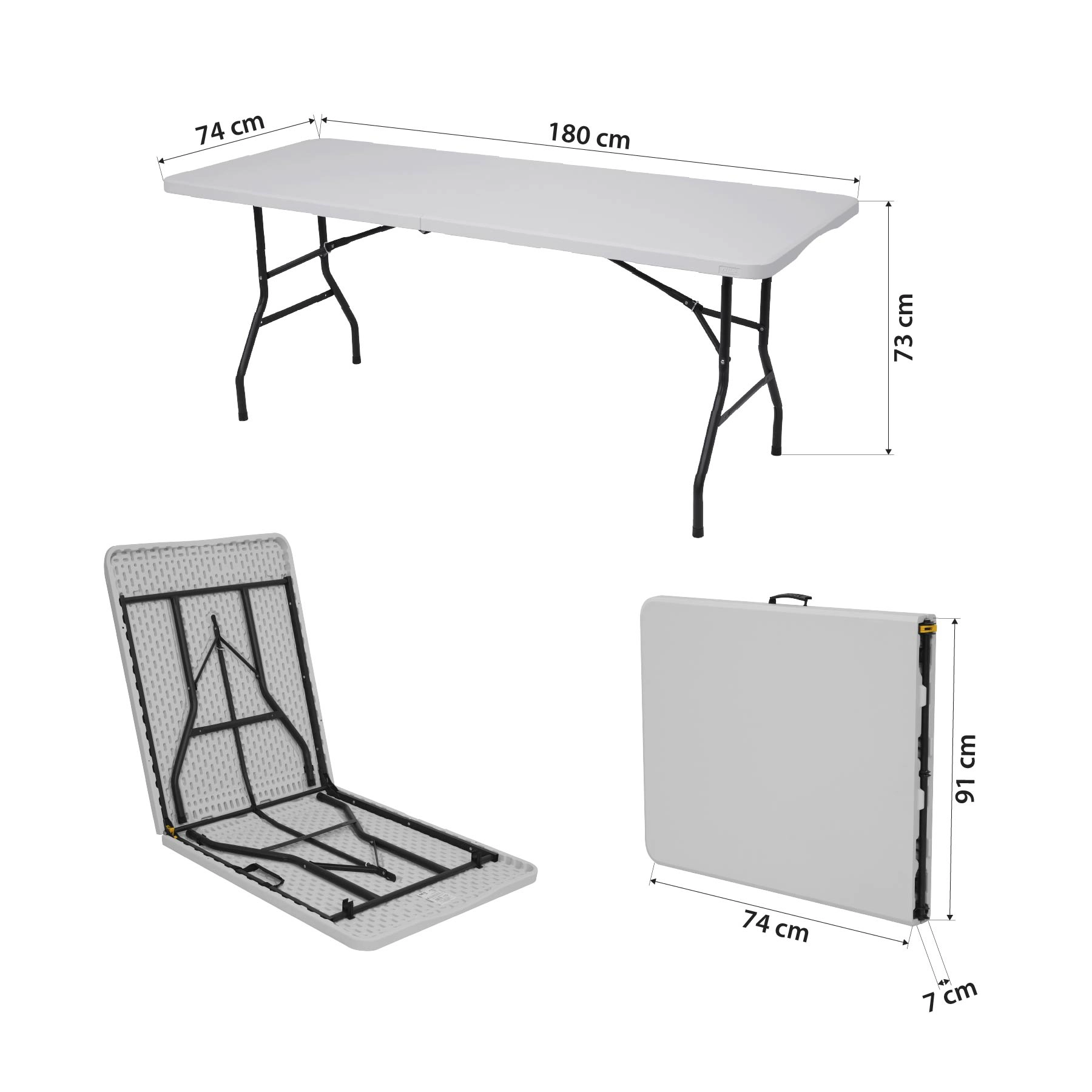 Przestronna powierzchnia 180 × 74 cm zapewnia wystarczająco dużo miejsca dla gości, przekąsek i wyposażenia. Ergonomiczna wysokość 73 cm jest wygodna do siedzenia i pracy na stojąco. Praktyczny system składania zamienia stół w kompaktową „walizkę” z uchwytem transportowym, dzięki czemu łatwo zmieścisz go w samochodzie, szafie lub pod łóżkiem.