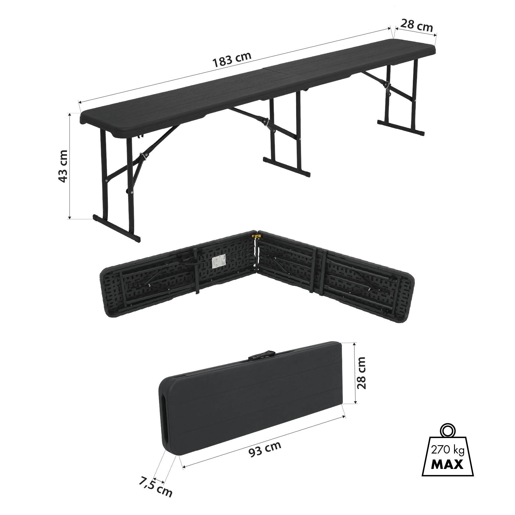 Praktyczna i wytrzymała składana ławka do ogrodu, na kemping i wydarzenia. Oferuje długą powierzchnię siedzenia 183 cm, udźwig do 270 kg, łatwe składanie oraz niską masę 6,5 kg. Konstrukcja z HDPE i stali malowanej proszkowo gwarantuje stabilność, łatwe czyszczenie i długą żywotność.