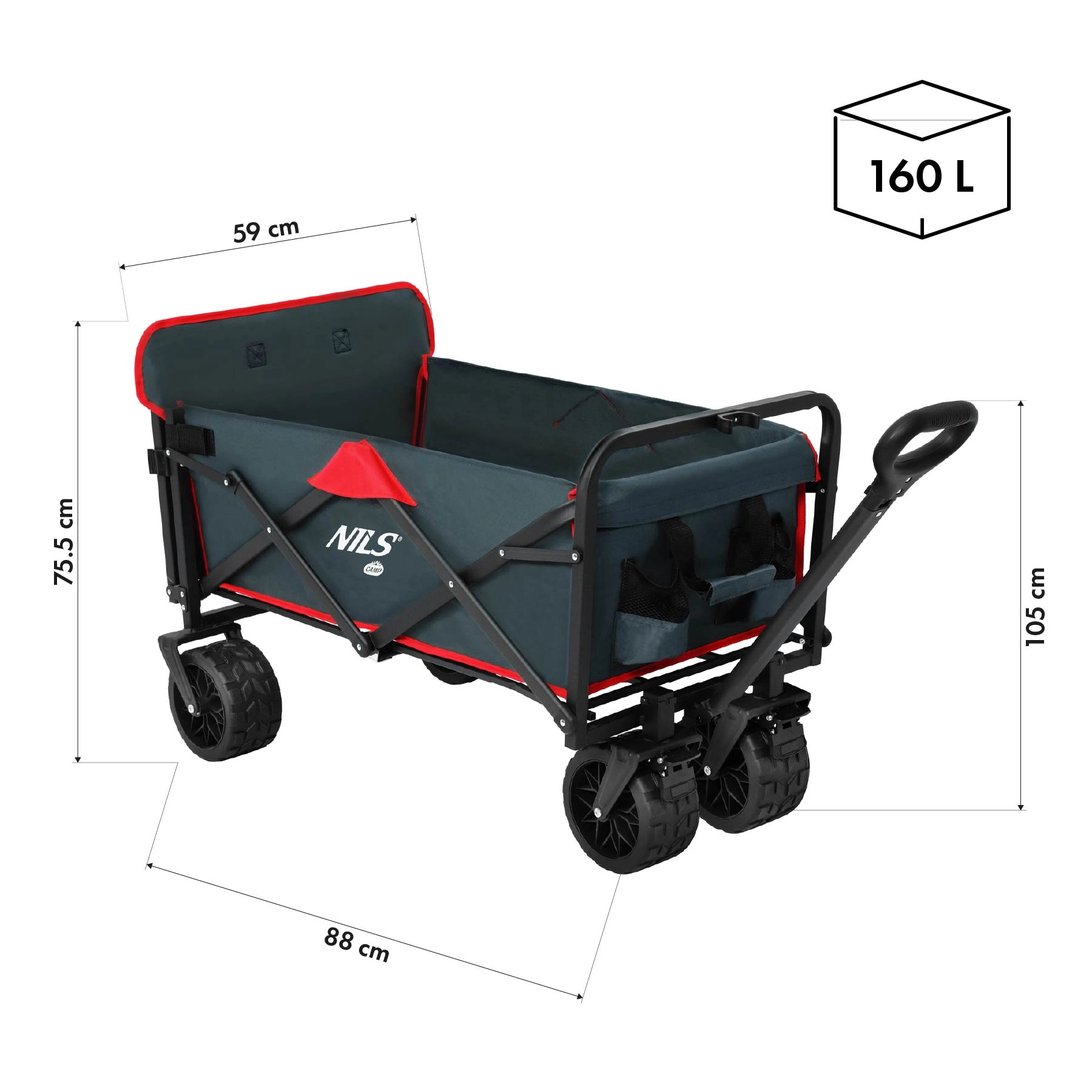 Wózek NILS Camp NC2601 to uniwersalny pomocnik w podróży, na kempingu i na plaży. Stabilna stalowa konstrukcja z lakierem proszkowym jest odporna na korozję i obciążenia, a skrzynia z tkaniny 600D Oxford wytrzymuje wymagające warunki. Dzięki pojemności 160 litrów i udźwigowi 100 kg wygodnie przewieziesz wyposażenie na piknik, sport i weekendowy wyjazd.