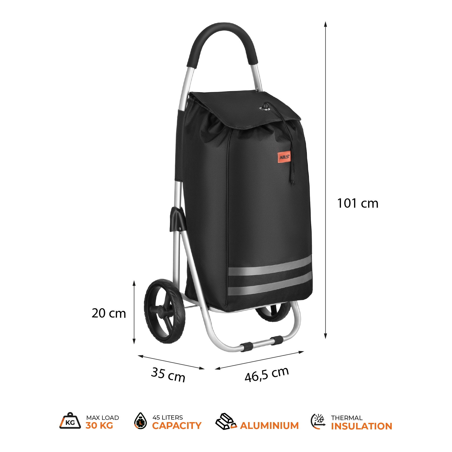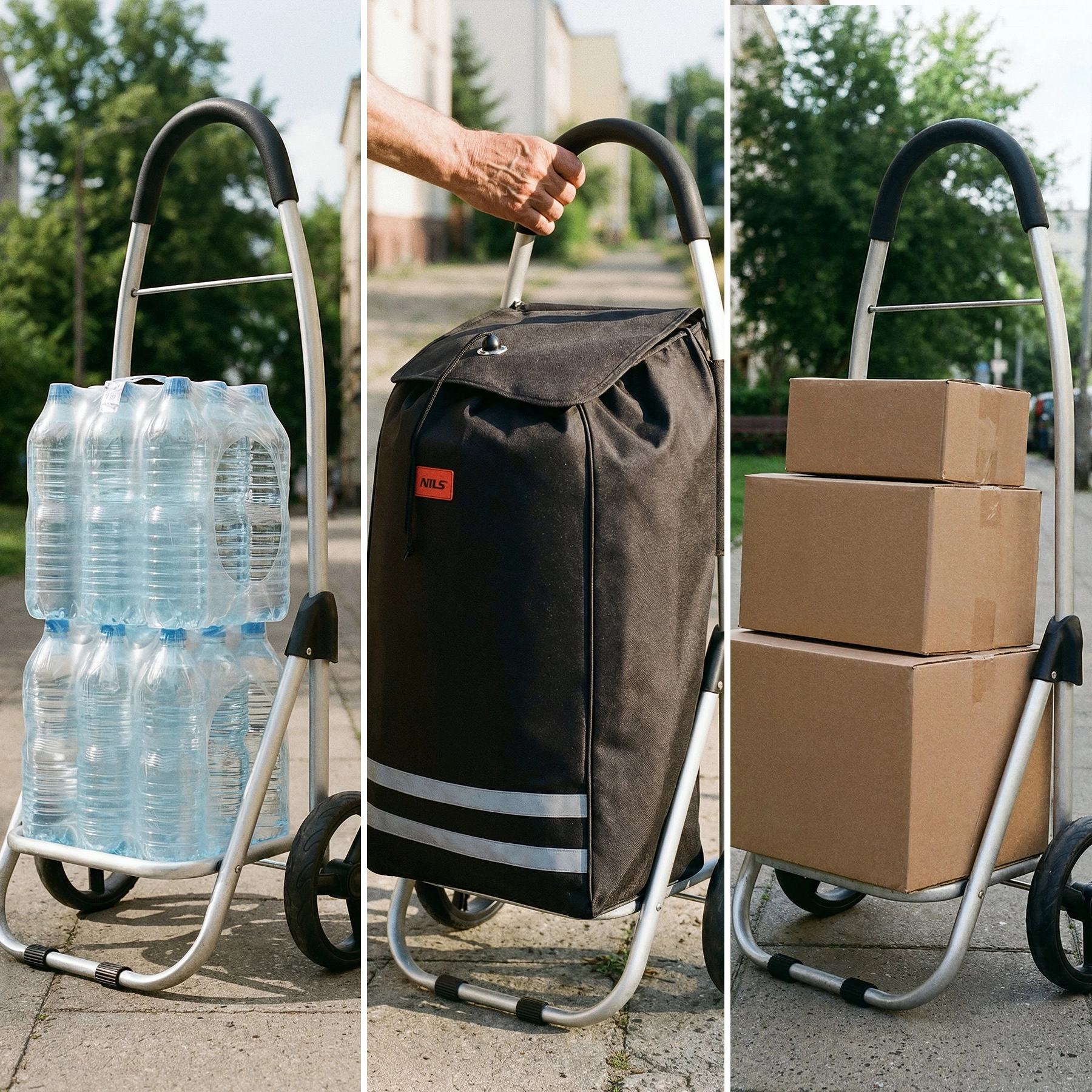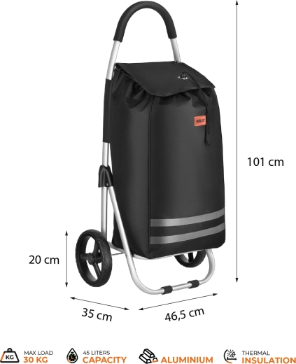 Wózek zakupowy NILS to przemyślany pomocnik do codziennych zakupów. Wytrzymała torba z poliestru 900D z wewnętrzną warstwą termoizolacyjną dłużej utrzymuje świeżość żywności, a aluminiowa rama zapewnia stabilność przy niskiej wadze. Główna komora ze ściągaczem na sznurek i klapą bezpiecznie chroni zawartość przed wypadnięciem i deszczem.