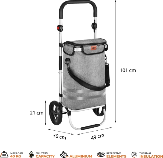 Bez trudu przewieziesz duże zakupy dzięki pojemności 50 litrów i udźwigowi do 40 kg. Lekki aluminiowy stelaż zapewnia stabilność i niską wagę dla wygodnej obsługi.