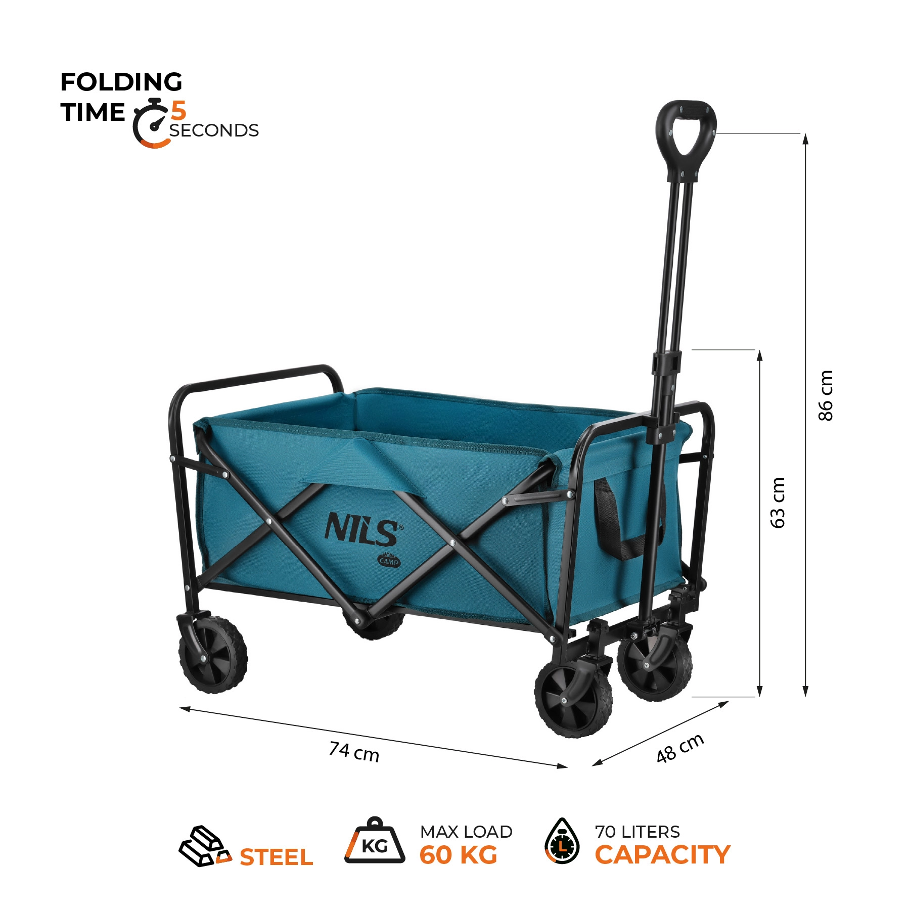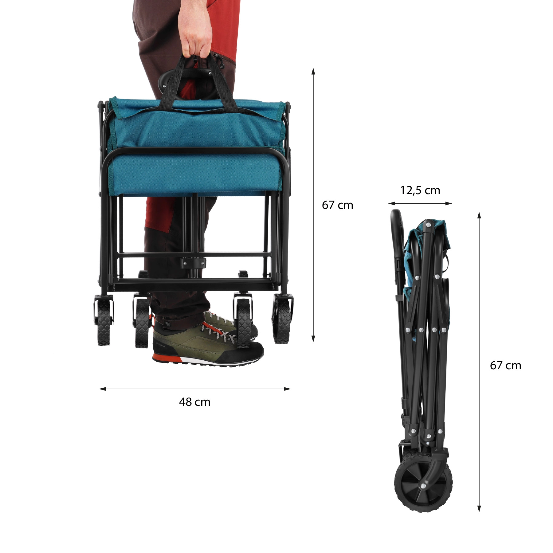 Praktyczny wózek kempingowy w turkusowym kolorze jest idealny na plażę, piknik, kemping oraz codzienne zakupy. Dzięki szybkiemu systemowi składania w kilka chwil przygotujesz go do użycia, a po wszystkim łatwo schowasz do bagażnika auta lub szafy. Solidna stalowa rama z powłoką proszkową oraz wytrzymała tkanina 600D Oxford z PVC zapewniają długą żywotność i ochronę przewożonych rzeczy.