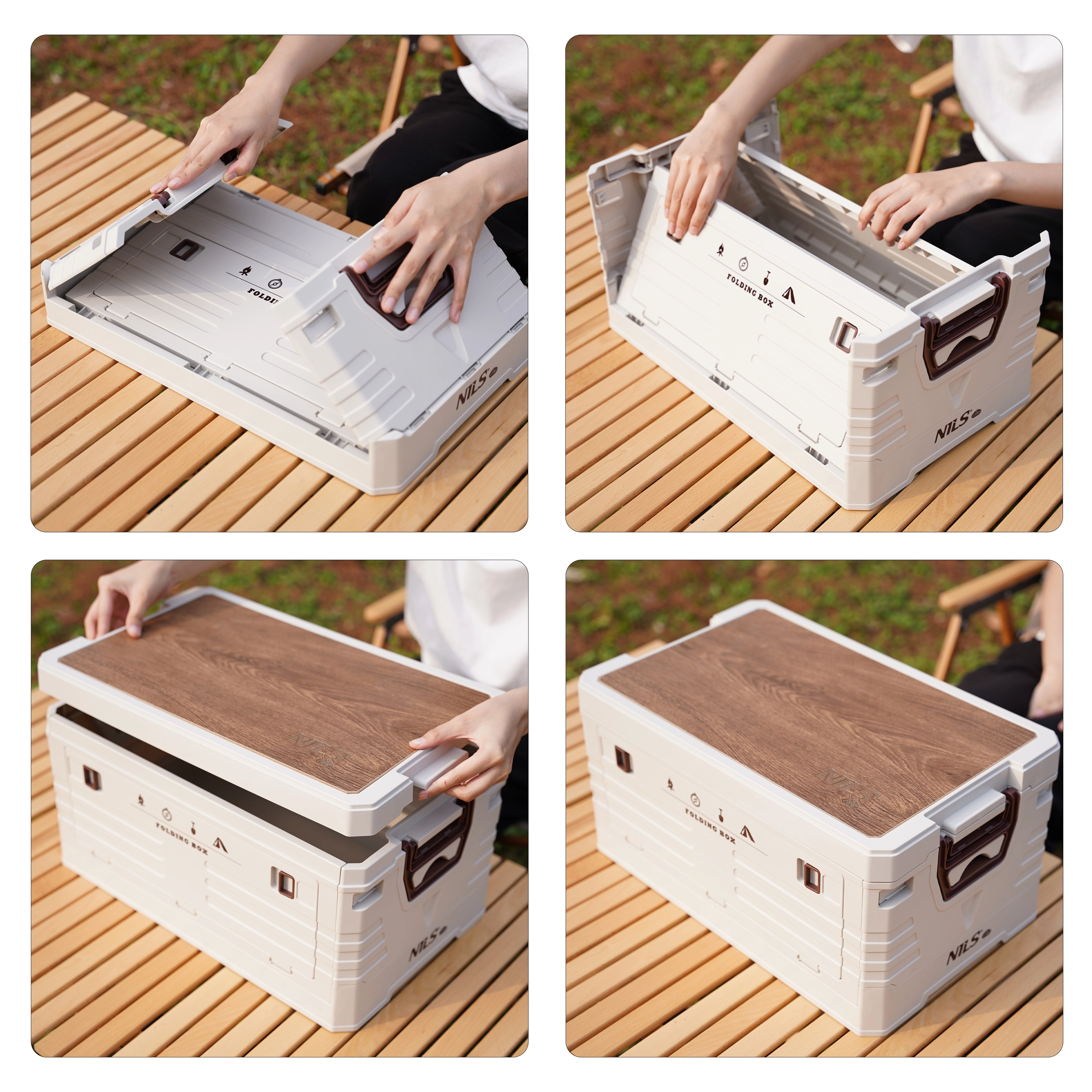 Wyjmowany drewniany blat w mgnieniu oka zamienia box w stabilny stolik lub powierzchnię roboczą – idealną na kemping, do ogrodu i do warsztatu.