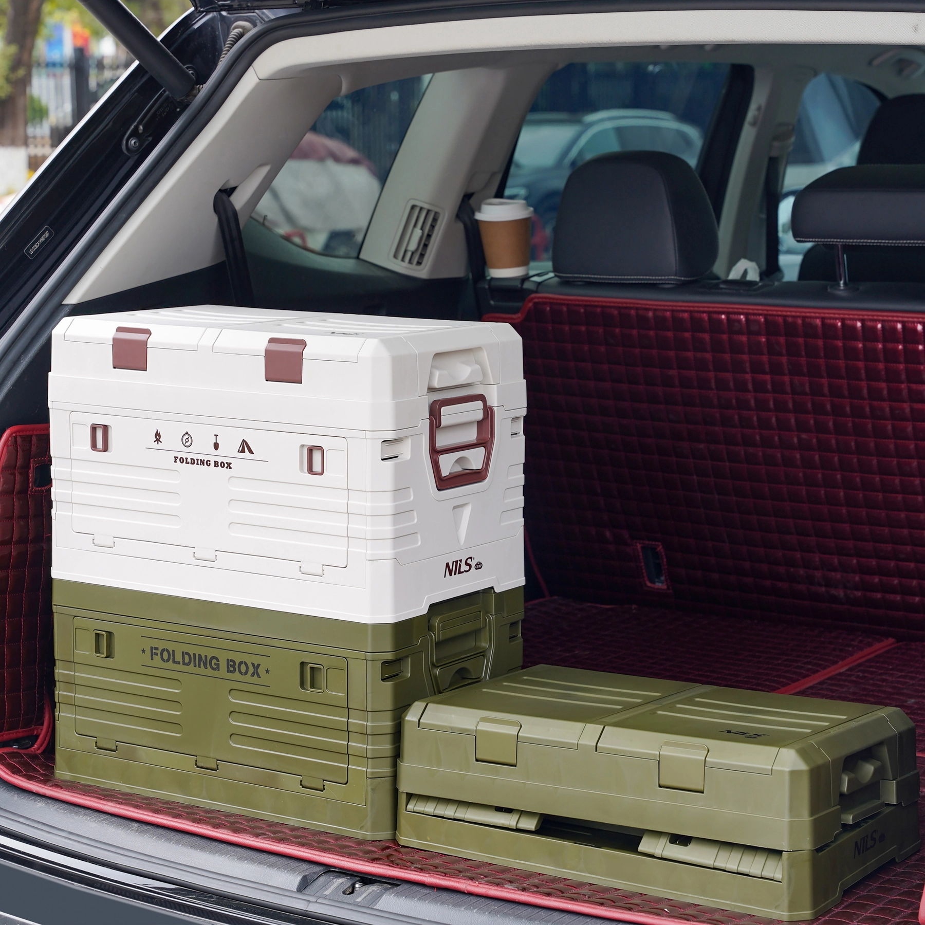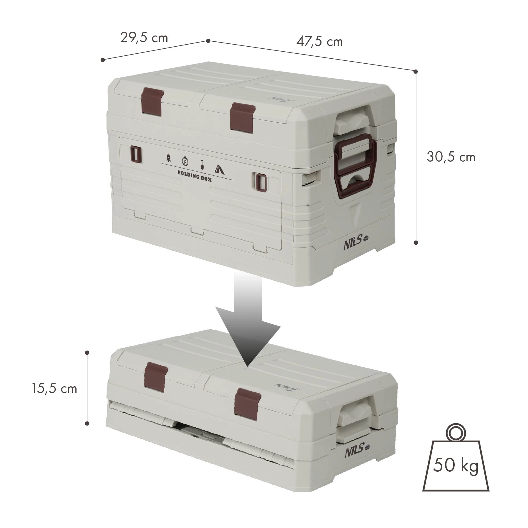 Przemyślane dwie przegródki w pokrywie utrzymają kable, śrubki, klucze czy drobne akcesoria zawsze pod ręką, bez mieszania się z rzeczami w głównej komorze. Po użyciu pojemnik łatwo złożysz do kompaktowej wysokości 15,5 cm i schowasz na przykład pod półką lub w bocznej wnęce bagażnika.