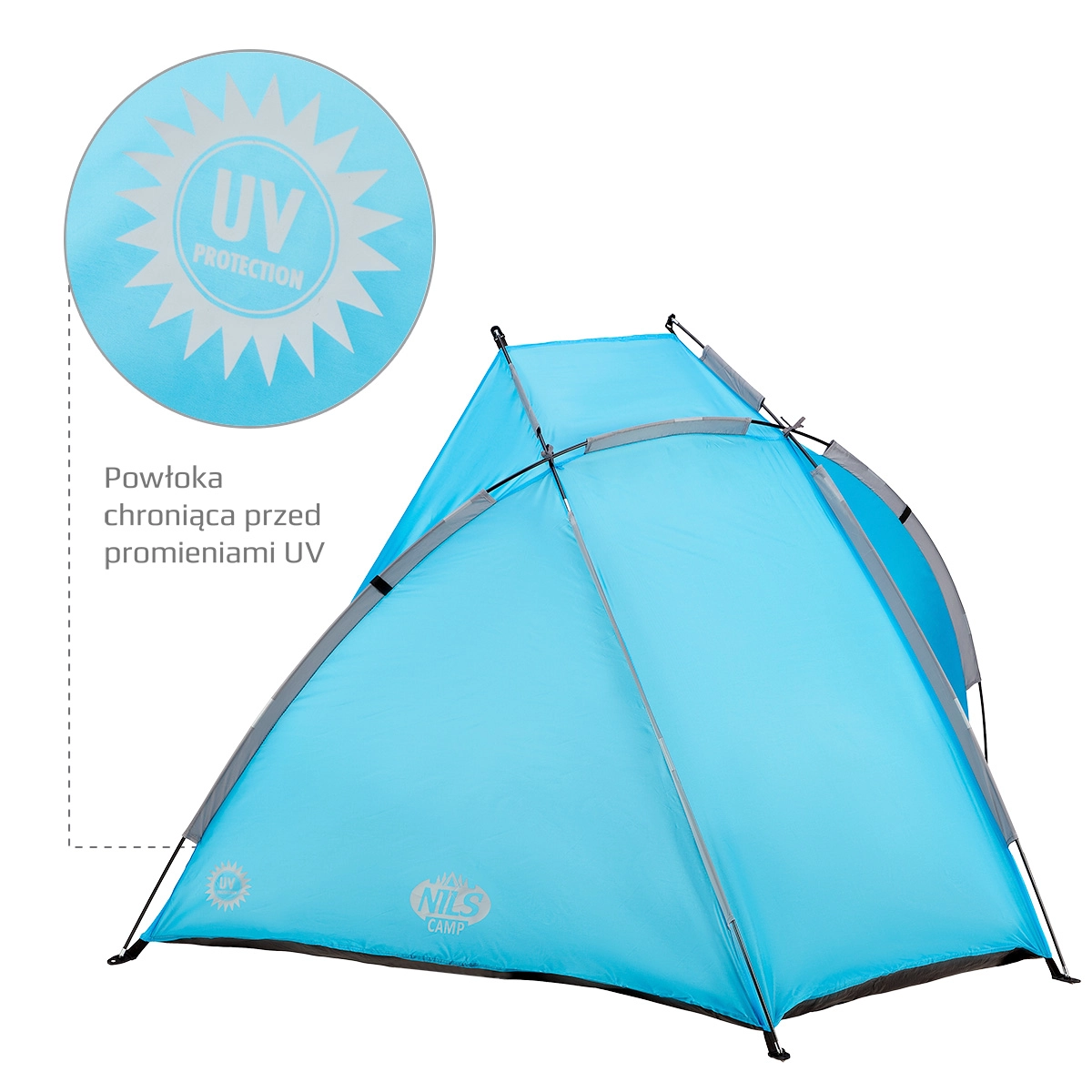 Lekki i poręczny namiot plażowy NILS Camp zapewnia niezawodne schronienie przed słońcem dla dzieci i dorosłych. Dzięki ochronie UV z odblaskowością do 96%, łatwemu montażowi z użyciem prętów z włókna szklanego oraz praktycznym kieszeniom jest idealny na plażę, basen i do ogrodu. Oferuje szybkie rozłożenie, ochronę przed wiatrem dzięki śledziom w zestawie oraz materiał odporny również na lekką przelotną mżawkę.