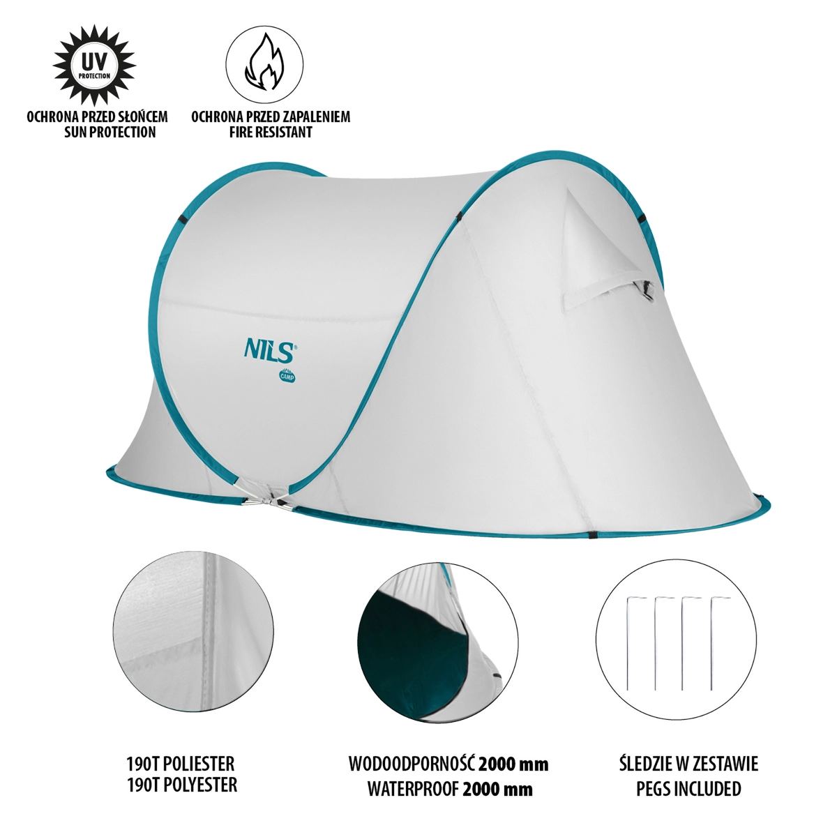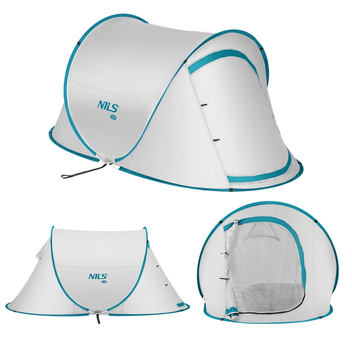 Namiot NILS Camp został zaprojektowany z myślą o szybkiej i wygodnej rekreacji nad morzem, jeziorem i w ogrodzie. Dzięki systemowi pop-up rozkłada się z torby transportowej w kilka sekund, bez narzędzi i skomplikowanej obsługi. Moskitiera i przednia płachta na zamek chronią przed owadami i wiatrem, a otwór wentylacyjny zapewnia świeże powietrze i przyjemny klimat wewnątrz.