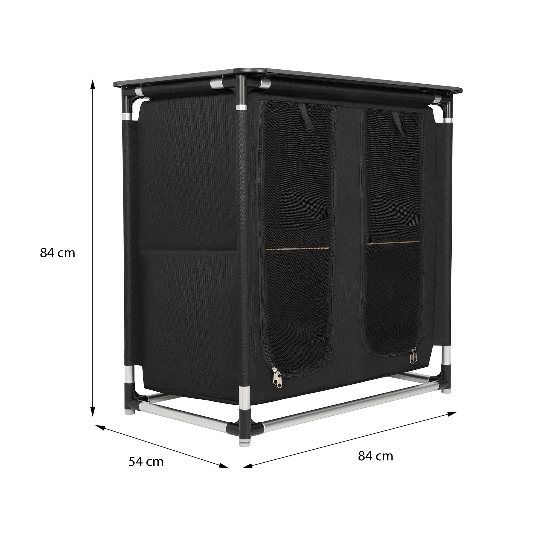 Wnętrze tworzą 4 wydzielone sekcje z półkami z laminowanej sklejki, idealne na żywność, naczynia, odzież lub sprzęt turystyczny. Przednie panele na zamek błyskawiczny chronią zawartość przed kurzem, wiatrem i owadami. Górny blat z 9 aluminiowych lameli o wymiarach 83 × 52 cm służy jako stabilna powierzchnia robocza lub odkładcza.