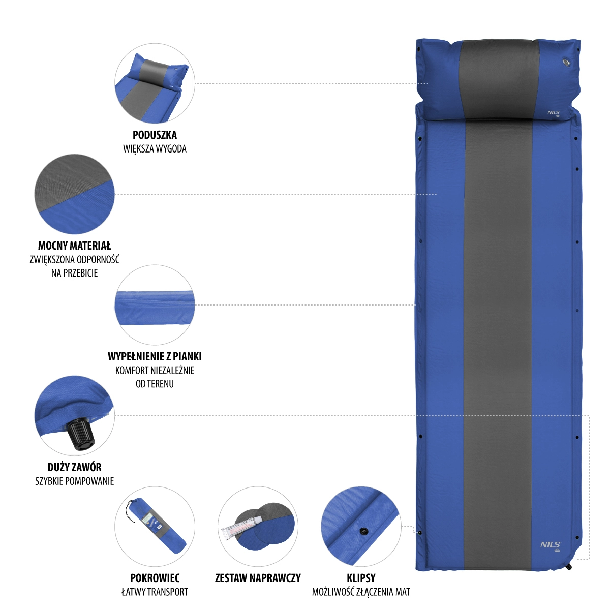 Boczne napy umożliwiają łatwe połączenie dwóch i więcej mat. Stwórz dużą, stabilną i komfortową powierzchnię do spania w namiocie.