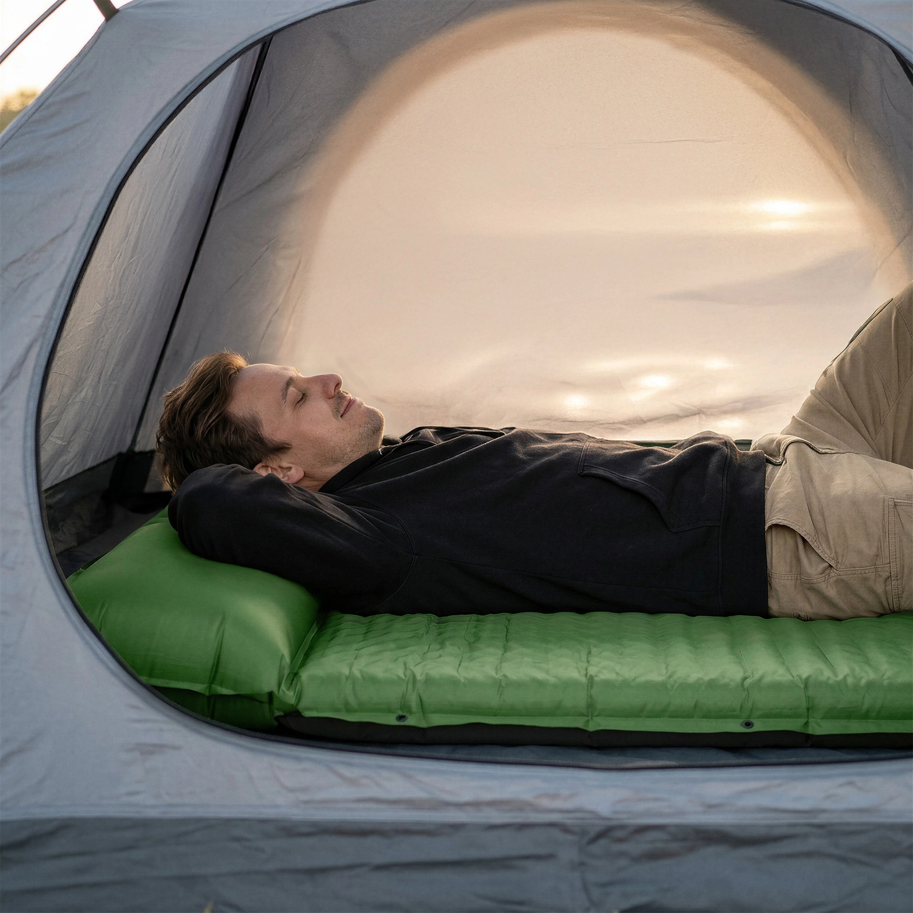 Ciesz się wygodą we dwoje gdziekolwiek w podróży. Ta przestronna samopompująca mata po otwarciu zaworu sama napełnia się powietrzem i w kilka chwil jest gotowa do użycia. Dzięki szerokości 130 cm zapewnia dużo miejsca dla par i rodzin, a wbudowana poduszka zwiększa komfort bez konieczności zabierania dodatkowego wyposażenia.