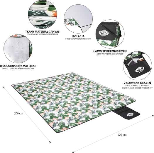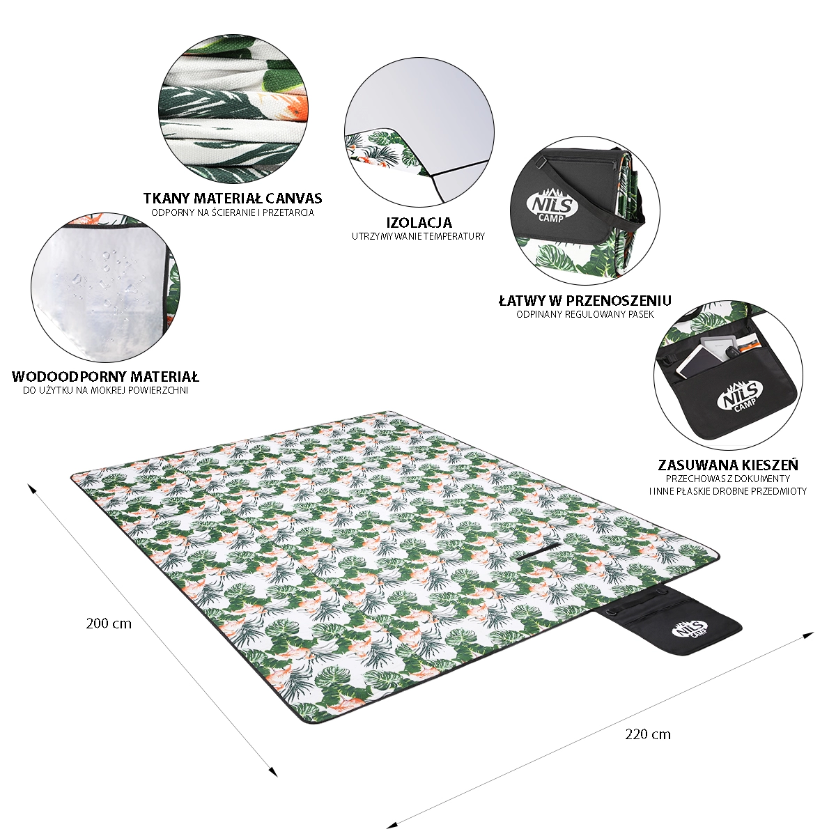 • Duży format — 200 × 220 cm na rodzinne pikniki i relaks.