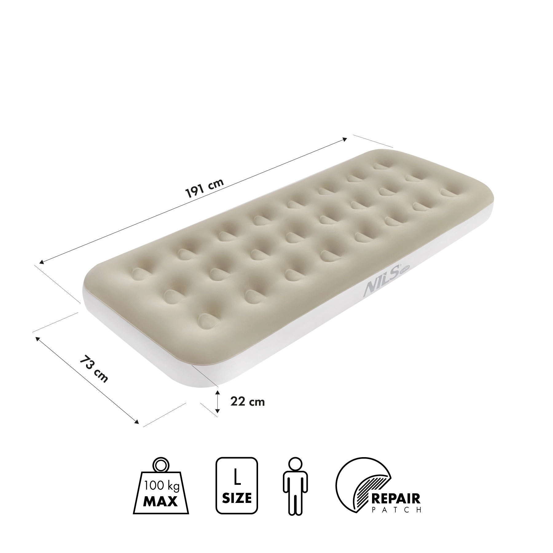 Wymiary 191 × 73 × 22 cm oraz nośność 120 kg sprawiają, że materac świetnie sprawdzi się na kempingu, w ogrodzie oraz jako dodatkowe miejsce do spania w domu.
