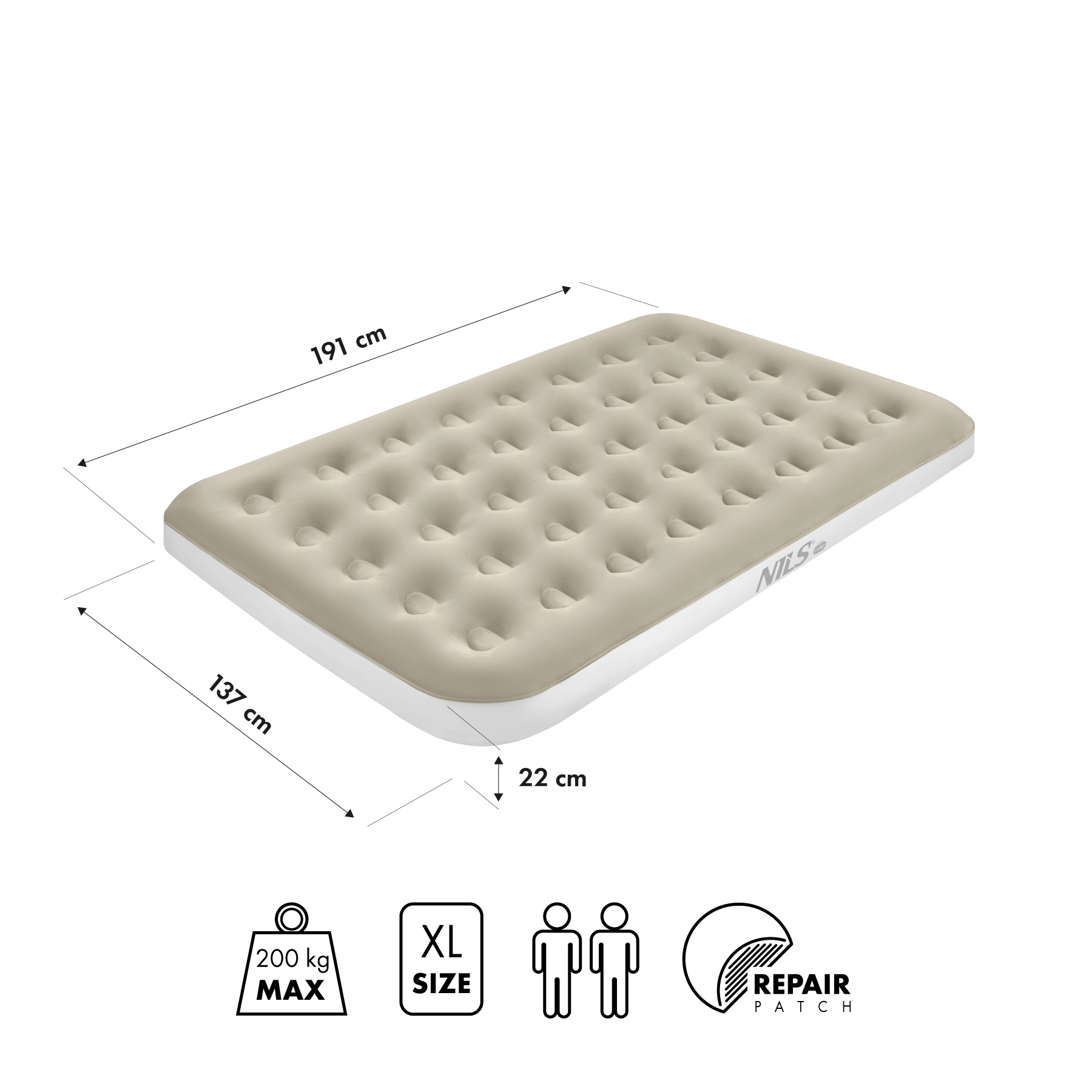 Materac dmuchany NILS Camp to świetny wybór jako dodatkowe łóżko w domu oraz wygodne posłanie do namiotu. Wymiary 191 × 137 × 22 cm odpowiadają standardowemu łóżku podwójnemu, więc komfortowo pomieszczą dwie osoby lub zapewnią dodatkową przestrzeń dla jednej osoby. Wysokość 22 cm gwarantuje skuteczną izolację od chłodu i nierówności podłoża, a jednocześnie przyjemny komfort snu.