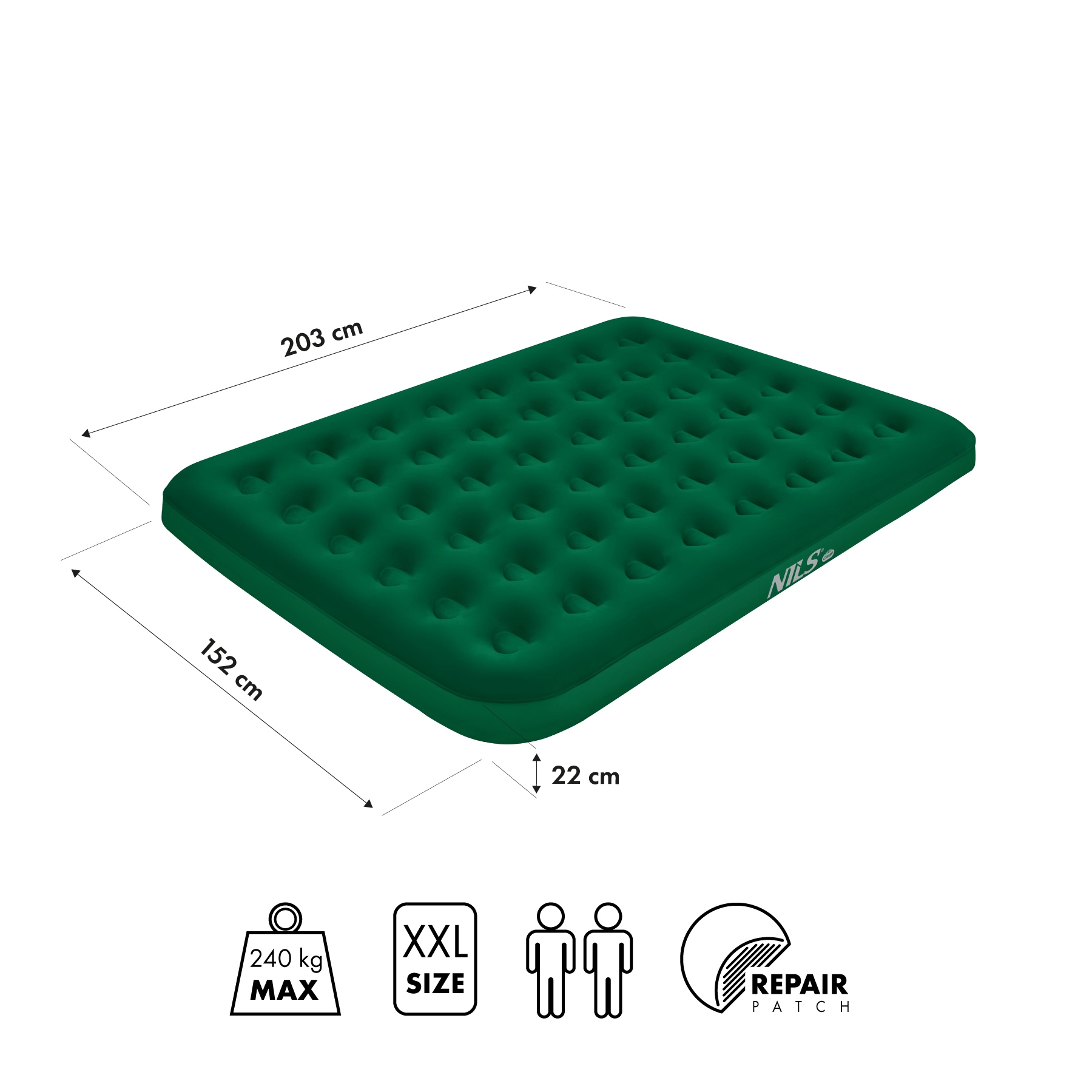Wygodna nadmuchiwana mata NILS Camp oferuje wymiary 203 × 152 × 22 cm dla komfortowego snu w domu i w podróży. Dzięki wytrzymałemu PVC, wysokiemu udźwigowi 240 kg i wysokości 22 cm świetnie izoluje od chłodu i nierówności. Podwójny zawór umożliwia szybkie pompowanie i spuszczanie powietrza ustami oraz pompką ręczną, nożną lub elektryczną.