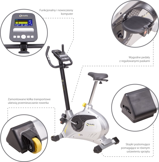 Regulacja siodełka w pionie (9 pozycji) i w poziomie, regulowana kierownica oraz solidna stalowa rama o udźwigu 120 kg. Stopki poziomujące i kółka ułatwiają przestawianie i wypoziomowanie.