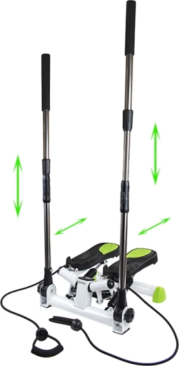 Dwa pionowe uchwyty z piankowymi rękojeściami i regulacją 102–138 cm zwiększają pewność podczas ćwiczeń, poprawiają postawę i pomagają utrzymać prawidłową technikę kroków.