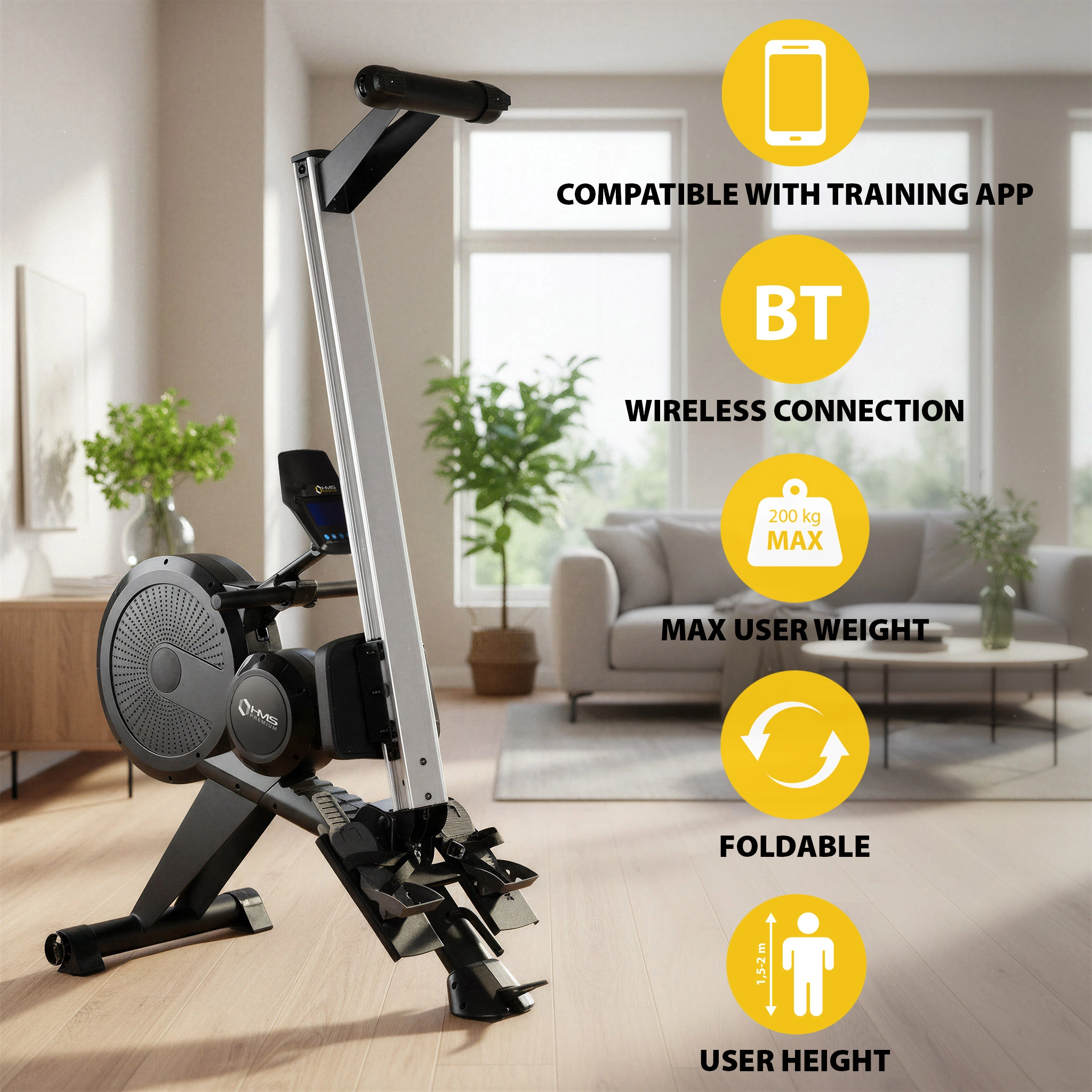 Zintegrowany wyświetlacz LCD pokazuje czas, czas na 500 m, dystans, kalorie, liczbę pociągnięć oraz tętno (z pasem piersiowym). Do dyspozycji jest 23 wstępnie zaprogramowanych trybów, 3 tryby interwałowe oraz 32 poziomy obciążenia do precyzyjnego dopasowania do kondycji i celów. Połączenie z KINOMAP dodaje interaktywne trasy, wyzwania online i dodatkową motywację.