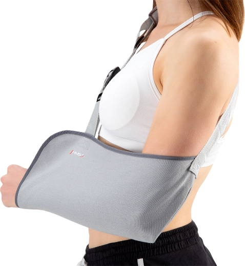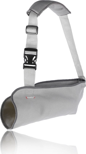Materiałowy worek temblaka bezpiecznie podtrzymuje przedramię i unieruchamia ramię w komfortowej pozycji, zmniejszając ból i zapobiegając niepożądanemu ruchowi podczas gojenia.