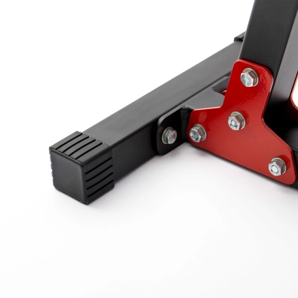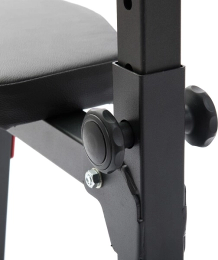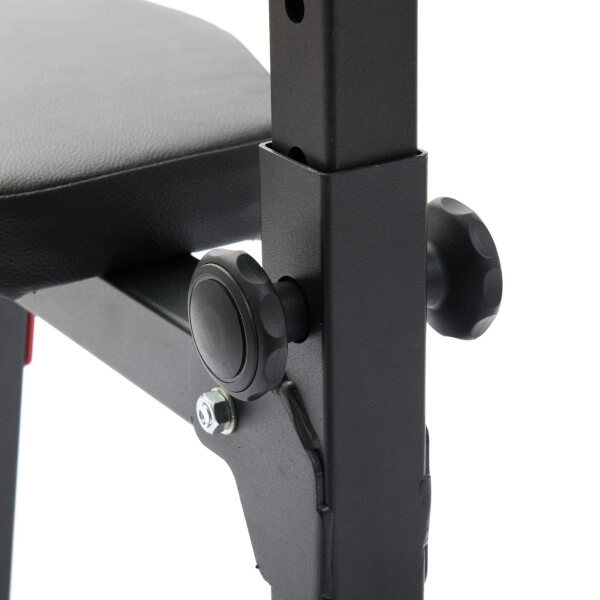 Ergonomicznie ukształtowana tapicerka z wysokiej jakości skóry syntetycznej z podwójnym szwem zapewnia wygodę nawet podczas wymagającego treningu. Haki odkładcze z grubą gumową ochroną minimalizują hałas i zapobiegają zarysowaniom gryfu oraz konstrukcji. Malowanie proszkowe chroni ramę przed ścieraniem i korozją, a gumowe stopki utrzymują ławkę stabilnie na miejscu bez uszkadzania podłogi.