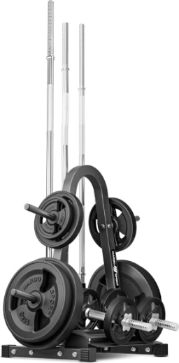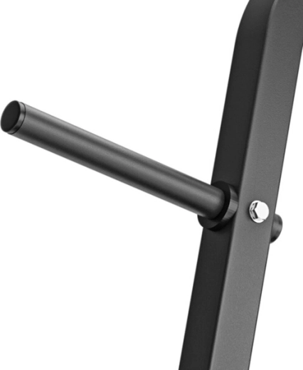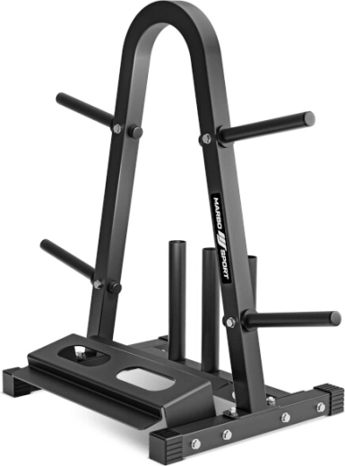 Stojak jest wyposażony w 4 trzpienie na talerze dla efektywnej organizacji obciążeń, 3 pionowe tuleje na gryfy oburęczne o średnicy 28–30 mm oraz praktyczną dolną półkę na 2 hantelki. Dzięki przemyślanemu układowi oszczędza miejsce i zwiększa bezpieczeństwo podczas treningu.