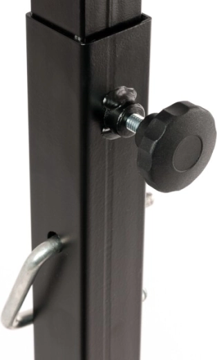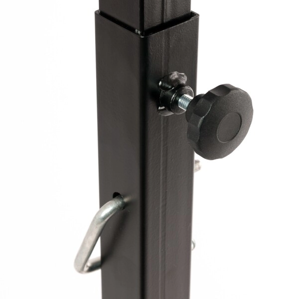 Praktyczna 7‑stopniowa regulacja z kołkami zabezpieczającymi szybko dopasuje stojaki do różnych ćwiczeń i wzrostu użytkownika.