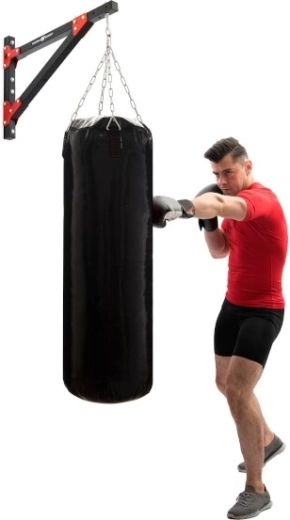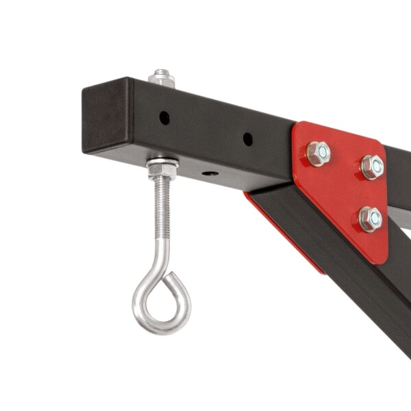 Praktyczne stalowe ucho jest zabezpieczone parą nakrętek dokręconych przeciwsobnie (kontra), co skutecznie zapobiega samoczynnemu luzowaniu podczas intensywnego treningu. Odległość punktu zawieszenia 70 cm od ściany zapewnia optymalną przestrzeń wokół worka na uniki, kopnięcia i kombinacje uderzeń, dzięki czemu trening jest komfortowy i bezpieczny.