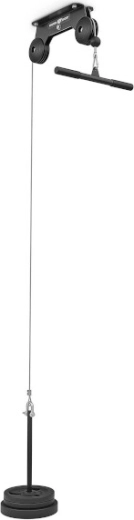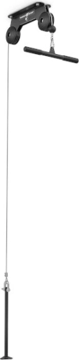 W zestawie znajduje się adapter tricepsowy, który rozszerza możliwości treningowe o ściąganie na triceps, przyciągania czy uginania bicepsów. Gumowy odbojnik na końcu linki chroni konstrukcję przy nagłym puszczeniu. Montaż do sufitu oszczędza miejsce i umożliwia płynne wykonywanie ćwiczeń, takich jak lat pulldown, ściąganie na triceps czy przyciągania w siadzie z własnym chwytem.