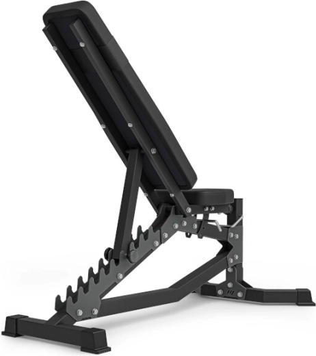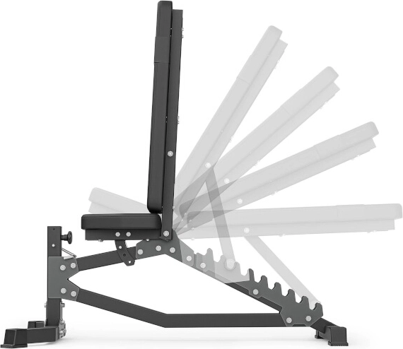 System drabinkowy z laserowo wycinanymi ząbkami umożliwia 10 dokładnych ustawień, w tym kąt ujemny -21°, więc łatwo dopasujesz nachylenie do wyciskań, wiosłowań i ćwiczeń bicepsów w siadzie.