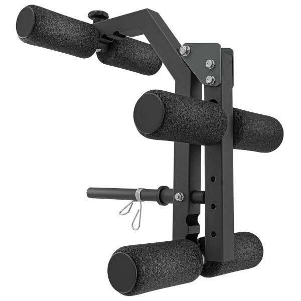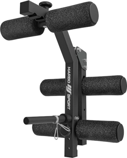 Dla maksymalnego komfortu wszystkie punkty kontaktu wyposażono w piankowe wałki EVA, które zachowują kształt nawet podczas intensywnego treningu. Górne i dolne ograniczniki stóp ustawisz w 3 pozycjach za pomocą ergonomicznej śruby, piankowe wałki pod kolanami mają 2 poziomy, a sam adapter można ustawić wysokościowo w 3 pozycjach — dzięki temu łatwo dopasujesz zakres ruchu i technikę. Trzpień na obciążenia o długości 21 cm i średnicy 25 mm jest kompatybilny ze standardowymi talerzami o średnicy do 36 cm.