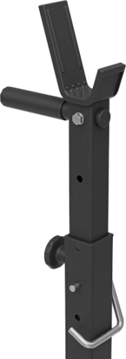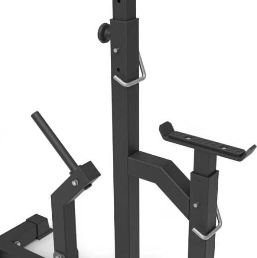 Szerokość stojaków ustawisz w 5 krokach (117–160 cm), a wysokość w 7 poziomach (92–152 cm); tak samo wysokość odbojów (58–88 cm). Ergonomiczne śruby i kołki zabezpieczające przyspieszają regulację, zintegrowane trzpienie na talerze zwiększają stabilność i służą jako praktyczne miejsce do przechowywania. Uchwyty pozwalają również na trening dipów.