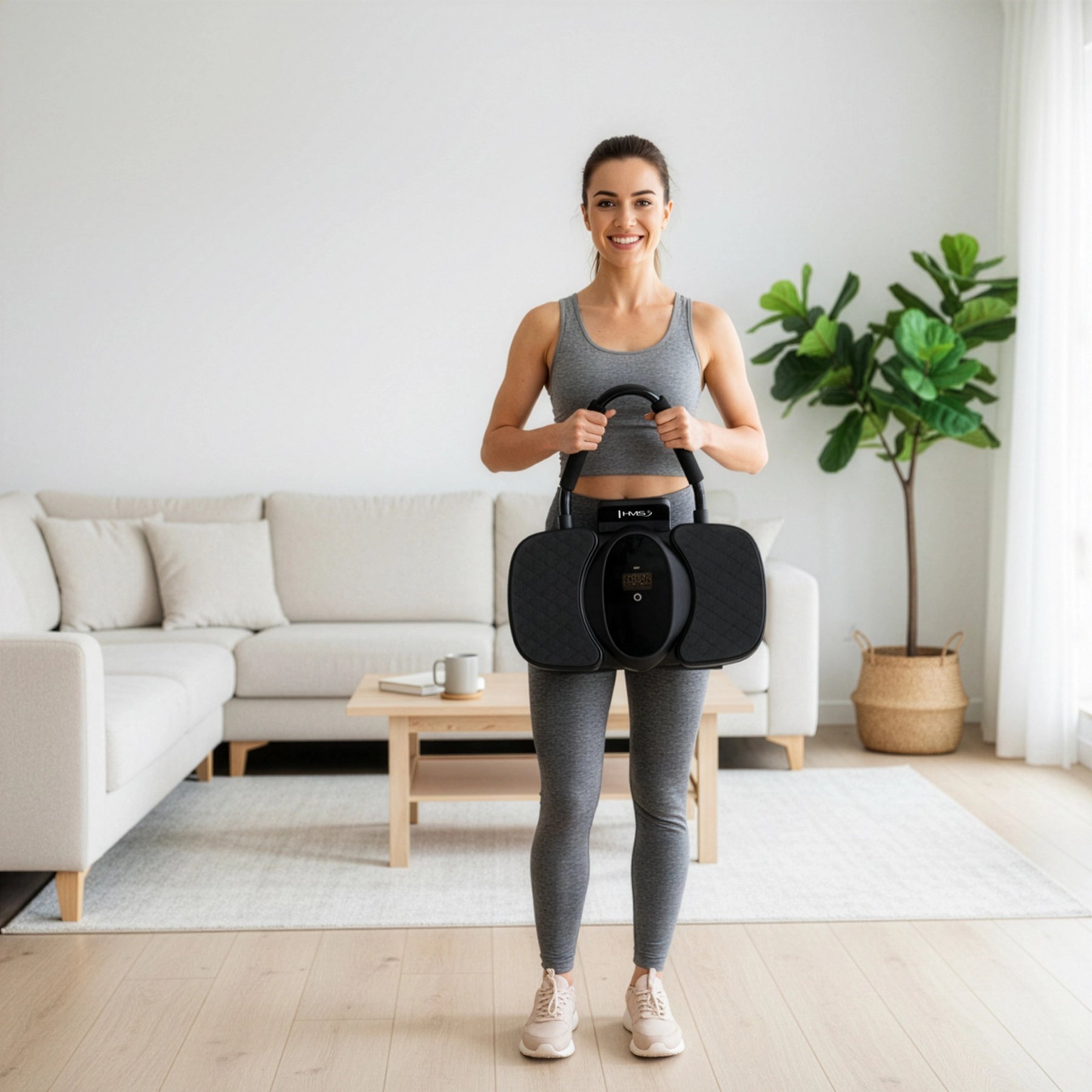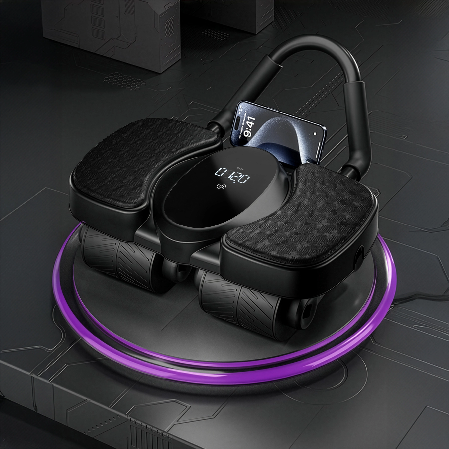 Dla komfortowego treningu nie brakuje szerokich podparć pod łokcie oraz miękkiej maty pod kolana. Wyświetlacz LCD czytelnie pokazuje czas, kalorie i liczbę powtórzeń, a uchwyt na telefon pozwala śledzić plany treningowe lub wideo. Dzięki szybkiemu montażowi na klik jest gotowy do użycia w kilka chwil, a USB‑C zapewnia łatwe ładowanie.