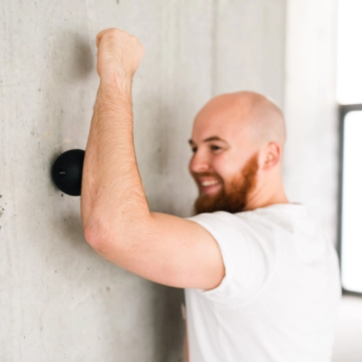 Wskazówka dotycząca użycia: Dociśnij piłkę do ściany lub podłogi w miejscu docelowym i powoli roluj przez 30–60 sekund. Oddychaj spokojnie, a nacisk dopasuj do aktualnego komfortu.