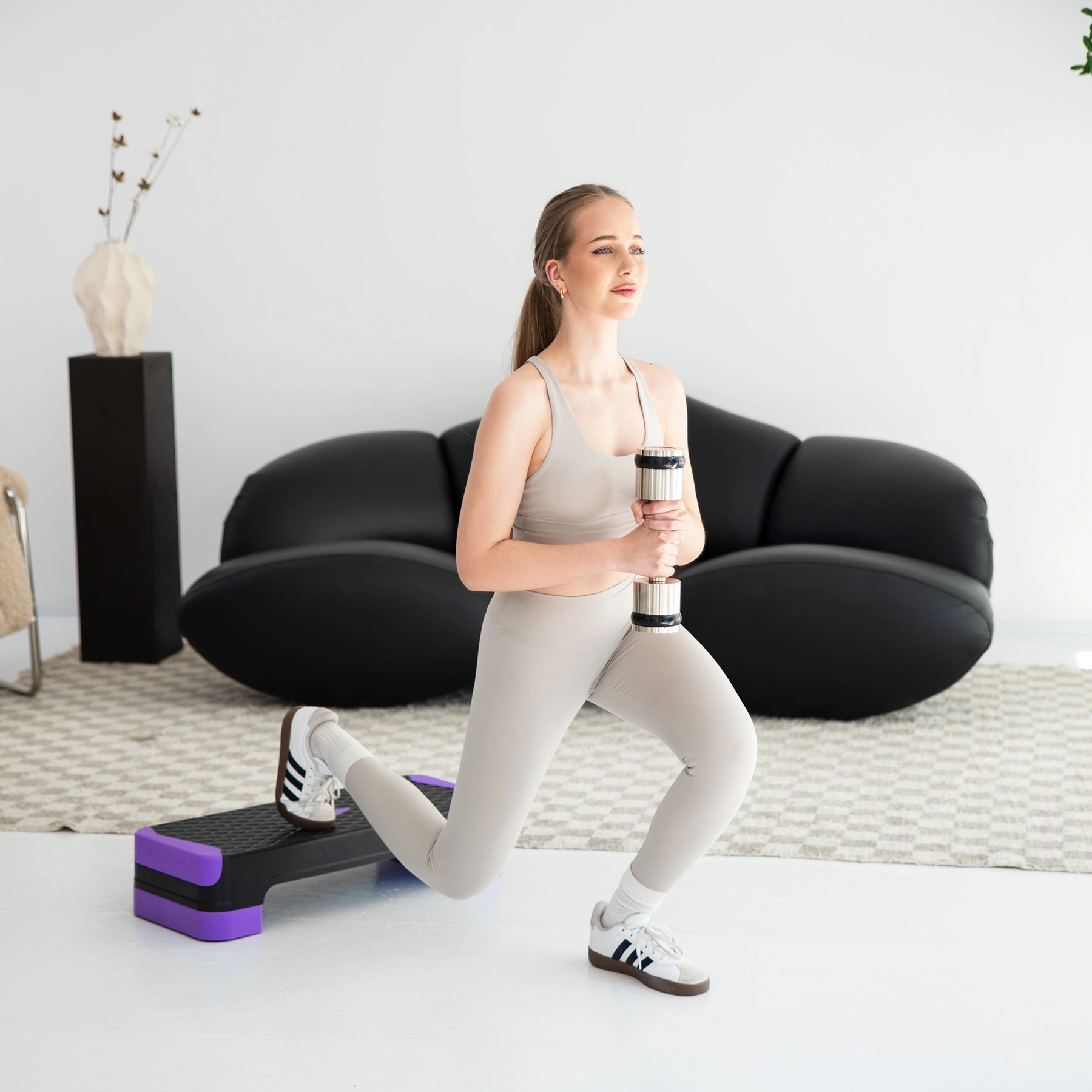 Antypoślizgowa powierzchnia i solidna konstrukcja zapewniają pewność przy stepowaniu, wykrokach oraz wzmacnianiu z hantlami w warunkach domowych.