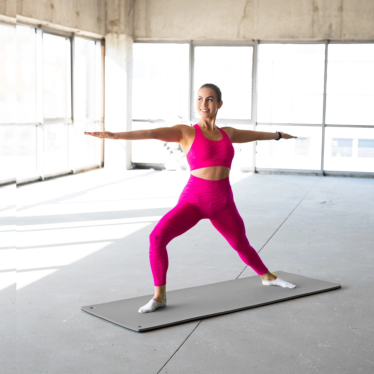Teksturowana powierzchnia i przyczepna warstwa spodnia utrzymują matę na miejscu, aby Twój ruch był pewny i bezpieczny nawet podczas dynamicznego treningu.