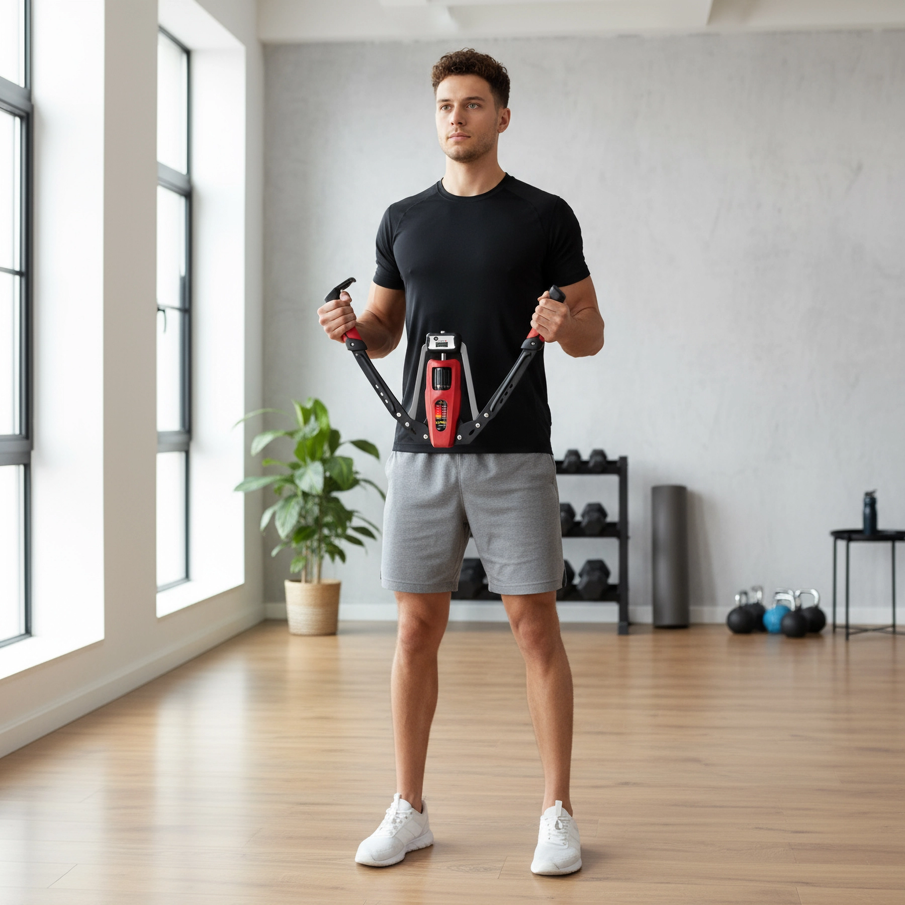 Solidna, a jednocześnie kompaktowa konstrukcja z blokadą przed rozwarciem oraz antypoślizgowymi uchwytami z TPR zapewnia komfort i pewność chwytu podczas ćwiczeń. Po złożeniu mierzy jedynie 43 × 17 cm i waży około 2,5 kg, więc łatwo zmieści się w szufladzie lub torbie sportowej. Sprawdzi się w ukierunkowanym treningu mięśni piersiowych, bicepsów, tricepsów, barków oraz górnej części pleców.