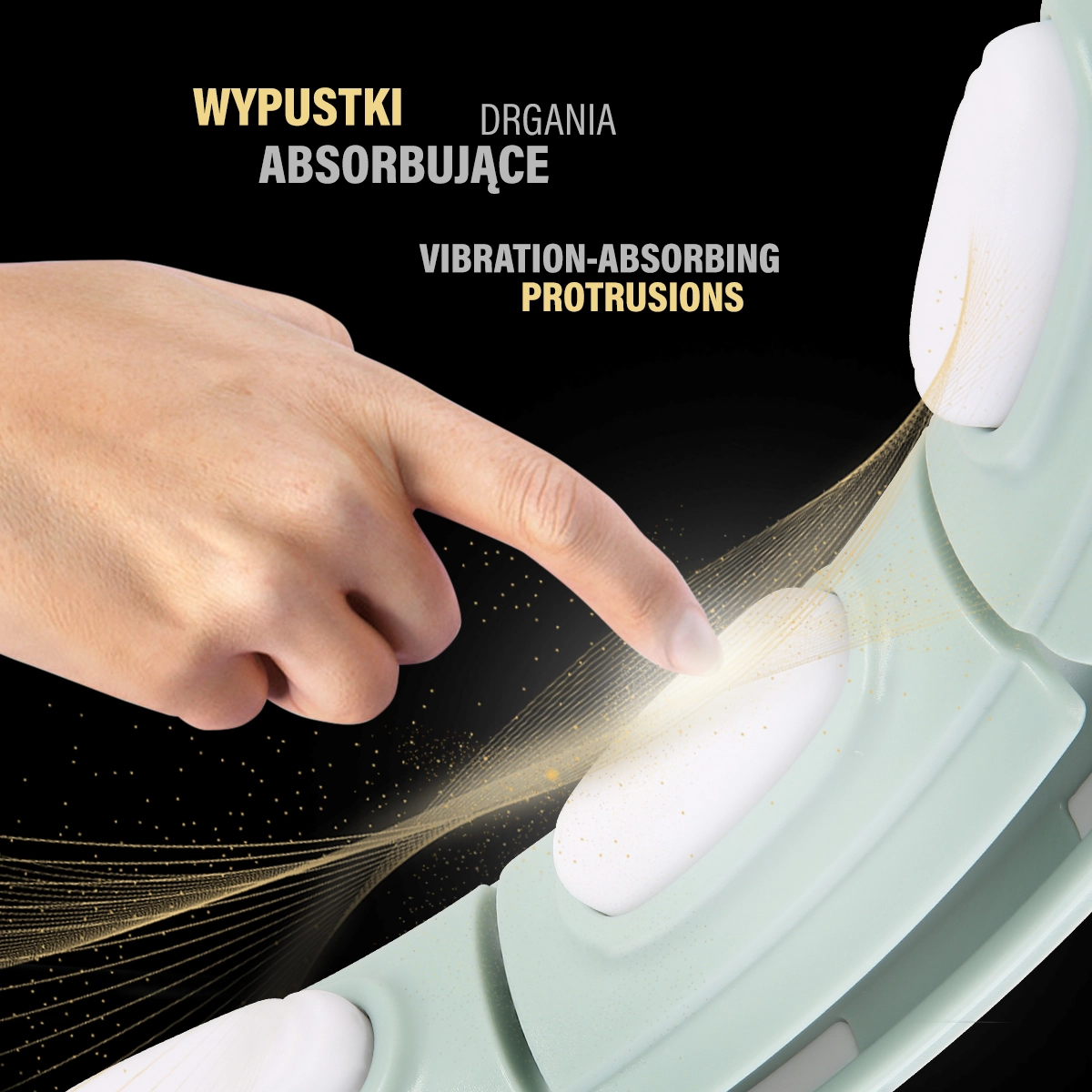 Obręcz HMS składa się z 16 łączonych elementów, które łatwo dopasujesz do obwodu talii. Wewnętrzne wypustki masujące z magnesami przyjemnie stymulują okolice brzucha i bioder, wspierają ukrwienie i mogą pomagać w redukcji tkanki tłuszczowej. Obrotowy obciążnik o masie 400 g na regulowanym sznurku (20–38 cm) zwiększa intensywność – im dłuższy sznurek, tym większa siła odśrodkowa i trudność ćwiczeń.