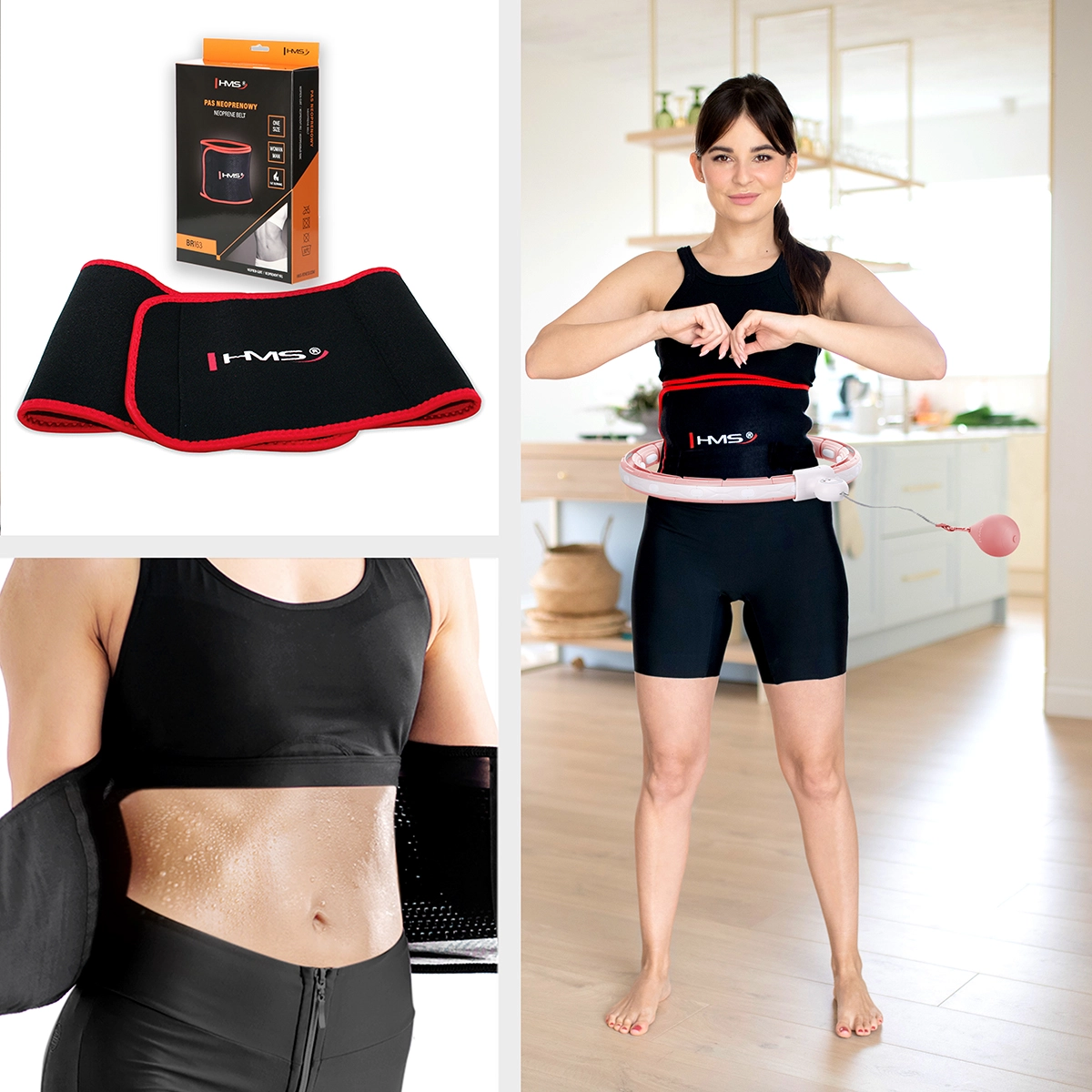 W zestawie znajduje się neoprenowy pas HMS BR163, który dzięki elastycznemu materiałowi i zapięciu na rzep doskonale dopasowuje się do sylwetki. Utrzymuje ciepło w okolicach centrum ciała, wspiera pocenie i można go nosić podczas ćwiczeń oraz w ciągu dnia. Wewnętrzna siateczka pomaga odprowadzać pot i poprawia cyrkulację powietrza dla większego komfortu.