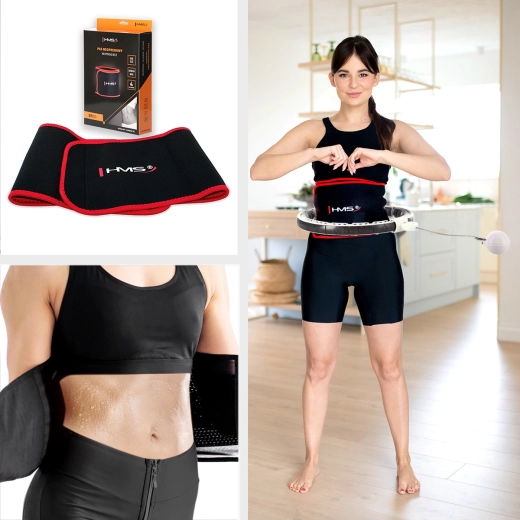Kompletny zestaw fitness do efektywnego kształtowania talii i brzucha: inteligentna masażowa obręcz HMS HHM16 z regulowanym obwodem, obciążnikiem obrotowym, magnetycznymi wypustkami masującymi oraz czytelnym licznikiem, uzupełniona o neoprenowy wyszczuplający pas BR163 zwiększający pocenie i wspierający spalanie kalorii.