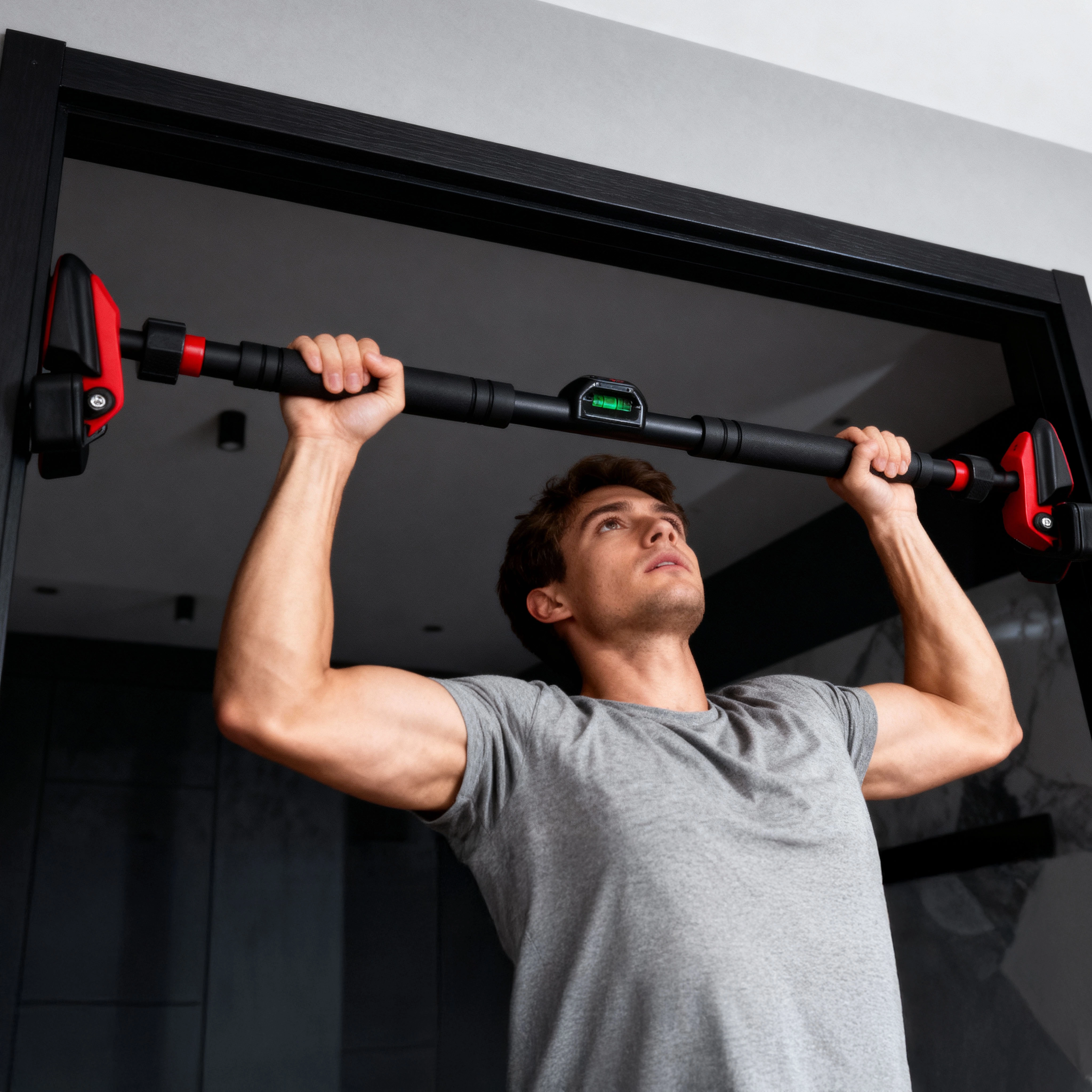 Wytrzymała wielowarstwowa stal teleskopowa zapewnia udźwig do 210 kg, a zamek bezpieczeństwa typu mortise & tenon zapobiega samoczynnemu luzowaniu. Miękkie antypoślizgowe powierzchnie podporowe z trójstrefową teksturą chronią ościeżnicę i utrzymują drążek stabilnie na miejscu. Montaż odbywa się całkowicie bez wiercenia, a osadzenie ułatwia zintegrowana poziomica. Piankowe uchwyty są wygodne i odporne nawet przy dłuższym treningu.