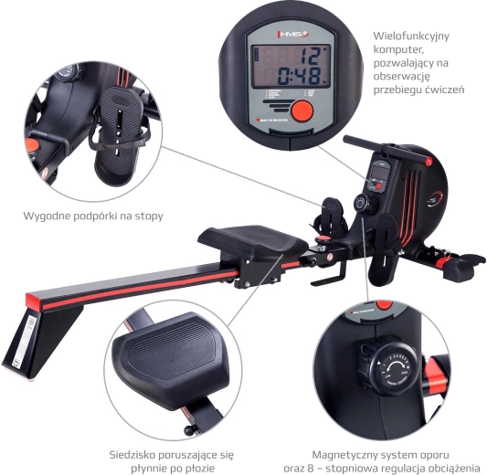 HMS ZM1502 to uniwersalny wioślarz do treningu całego ciała w domu. Magnetyczny system hamowania zapewnia cichą i płynną pracę, dzięki czemu wygodnie ćwiczysz nawet w mieszkaniu. Ergonomiczne siedzisko i długa prowadnica sprawiają, że ruch jest naturalny i łagodny dla stawów, a jednocześnie wspiera kompleksowy trening wytrzymałościowy (kardio).