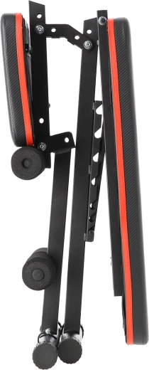 Komfort zapewnia gruba piankowa wyściółka siedziska i oparcia na solidnej płycie, trwała tapicerka o wyglądzie karbonu z powierzchnią antypoślizgową. Stalowa rama z wysokiej jakości profilami i szerokim podparciem siedziska/oparcia gwarantuje stabilność i długą żywotność. Po zakończeniu ćwiczeń ławkę szybko złożysz poprzez wyjęcie dwóch stalowych sworzni – idealne rozwiązanie do mniejszych przestrzeni.