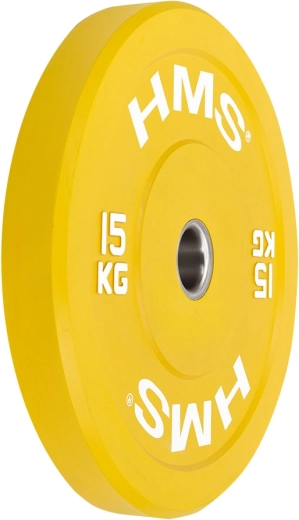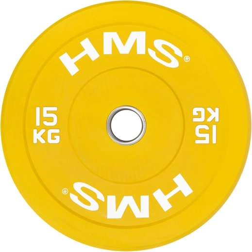 Profesjonalny kolorowy bumper HMS o masie 15 kg do podnoszenia ciężarów i treningu funkcjonalnego. Dzięki wytrzymałej gumie i nierdzewnej wkładce środkowej chroni podłogę i gryf, tłumi hałas przy zrzucie oraz jest w pełni kompatybilny z olimpijskimi gryfami 50 mm. Żółta kolorystyka odpowiada oznaczeniom startowym dla łatwej orientacji podczas treningu.