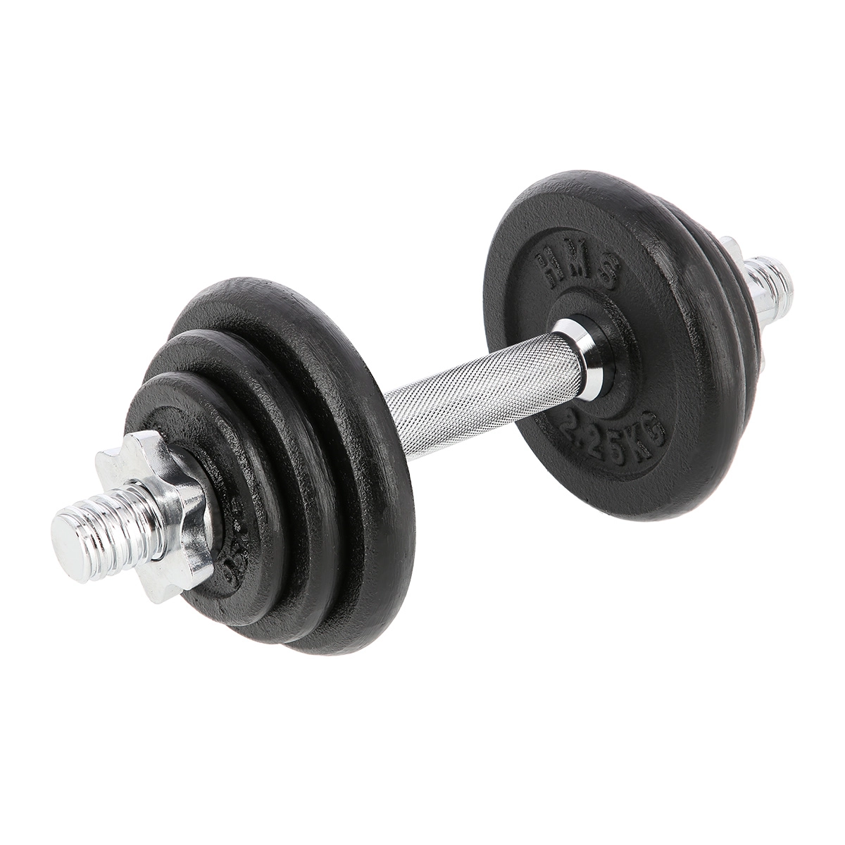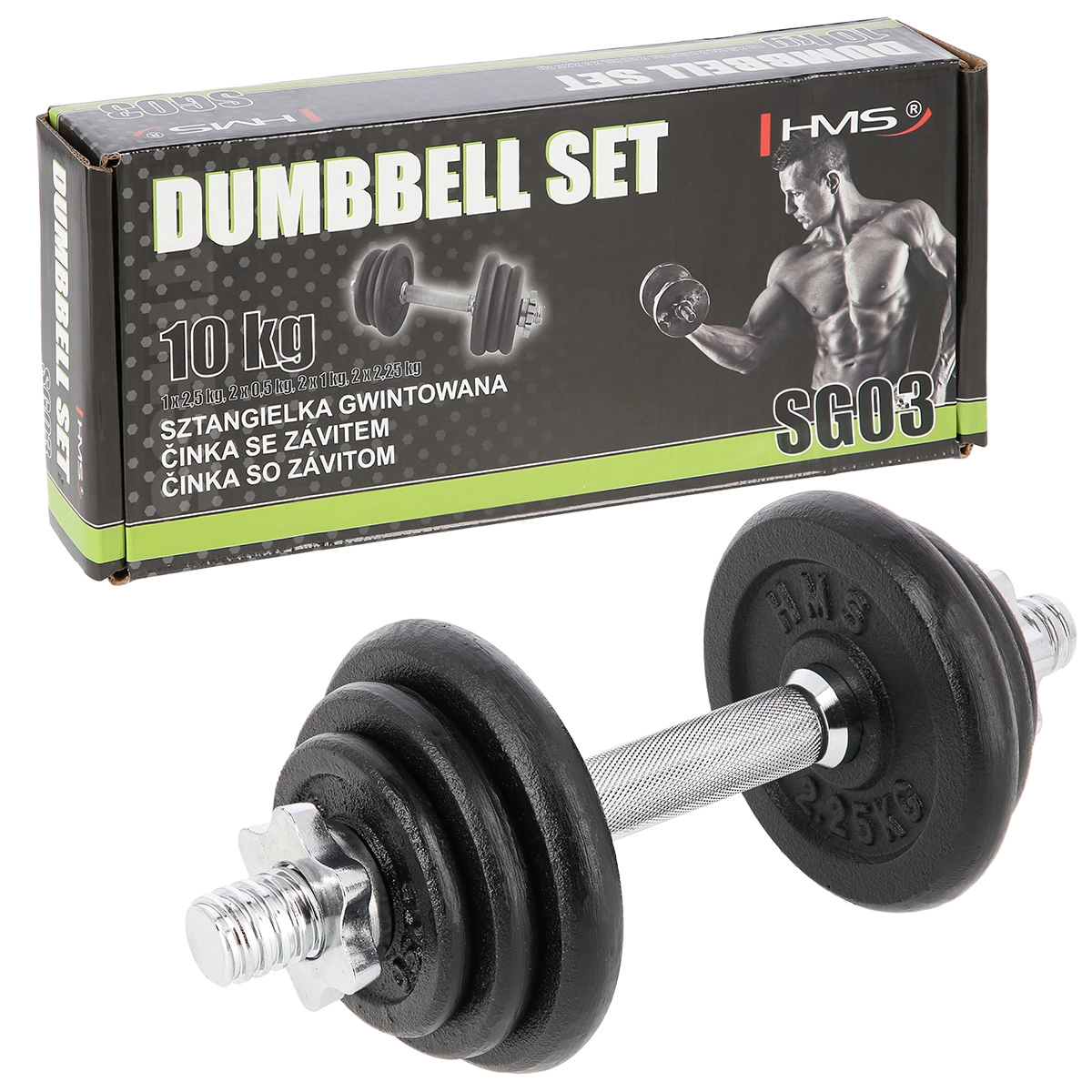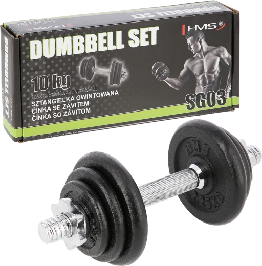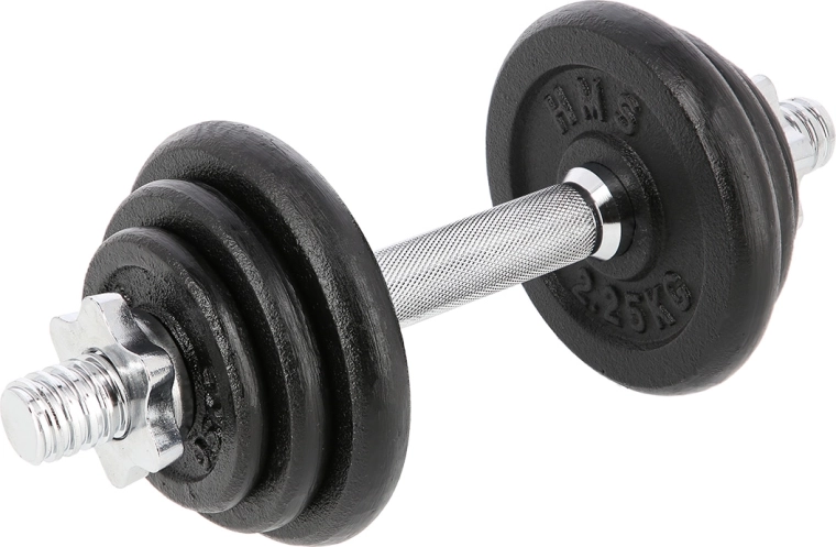 Uniwersalna jednorańczna hantla regulowana o masie 10 kg marki HMS do treningu w domu i na siłowni. Dzięki gwintowanym końcówkom i nakrętkom gwiazdkowym wymiana talerzy jest szybka i przede wszystkim bezpiecznie zabezpieczona. Żeliwne talerze oraz ryflowany, antypoślizgowy chwyt zapewniają stabilność, pewność i precyzyjne dopasowanie obciążenia do różnych ćwiczeń.