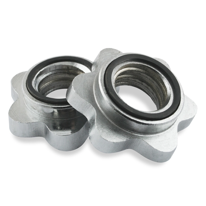 Dwie nakrętki śrubowe z wewnętrznym gumowym uszczelnieniem pewnie blokują talerze i zapobiegają ich luzowaniu podczas ćwiczeń.