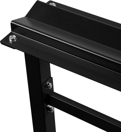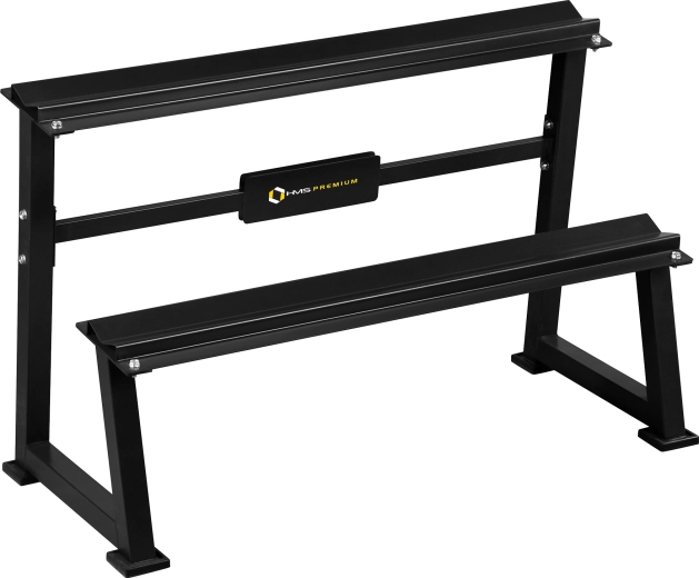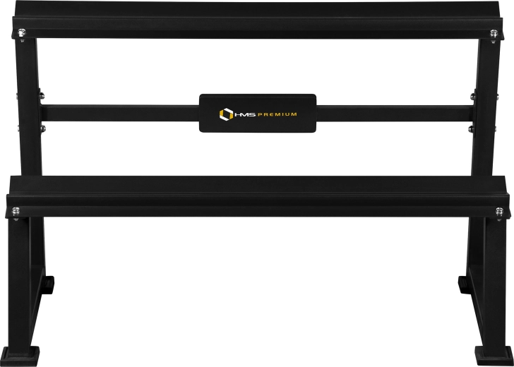 Dwie przestronne półki (122 × 22 cm) są pochylone dla łatwej i bezpiecznej manipulacji hantlami. Cztery nogi wyposażono w gumowe końcówki, które chronią podłogę i zwiększają przyczepność. Stojak to doskonały wybór do użytku komercyjnego i domowego.