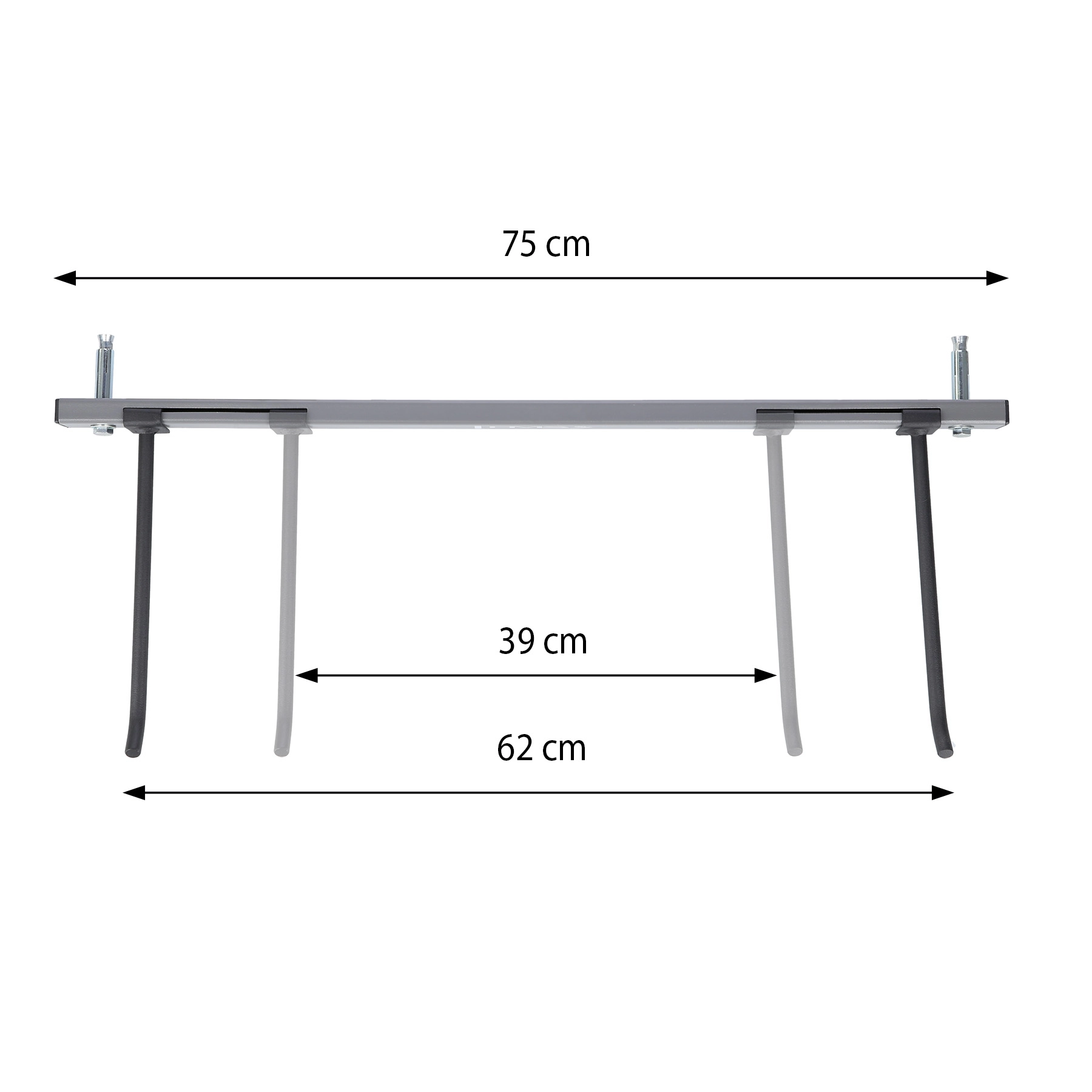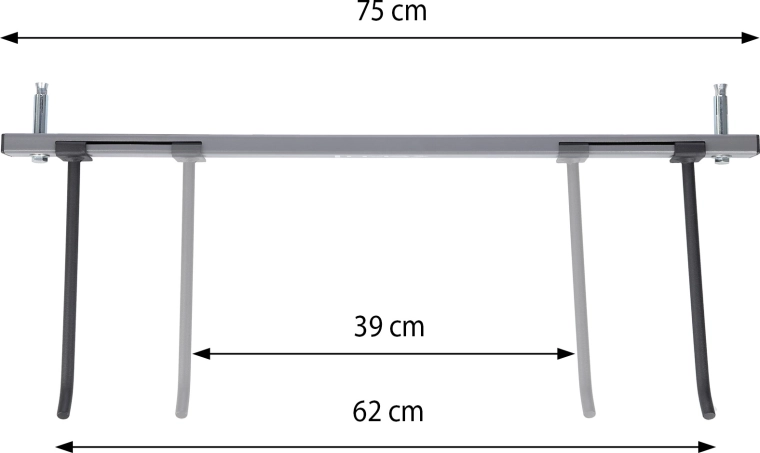 Haki o długości 25 cm i rozstaw 39–62 cm pozwalają zawiesić do 16 mat (w zależności od grubości) oraz dopasować uchwyt do różnych typów mat z oczkami.